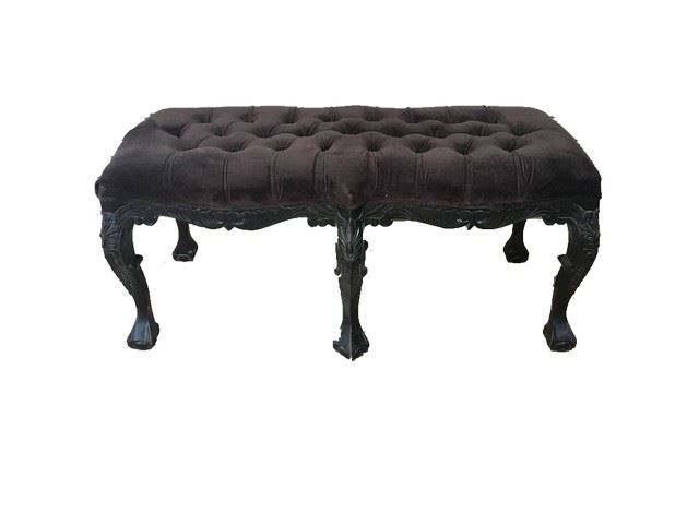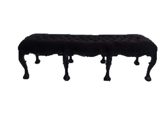 BN03 Black Ornate Tufted Seat Benches *2 different sizes* (8 legs) Dims: 65"W x 19"D x 21"H & (6 legs) Dims: 47"W x 19"D x 21"H Condition: lightly used/paint scratches /fabric may have sun damage