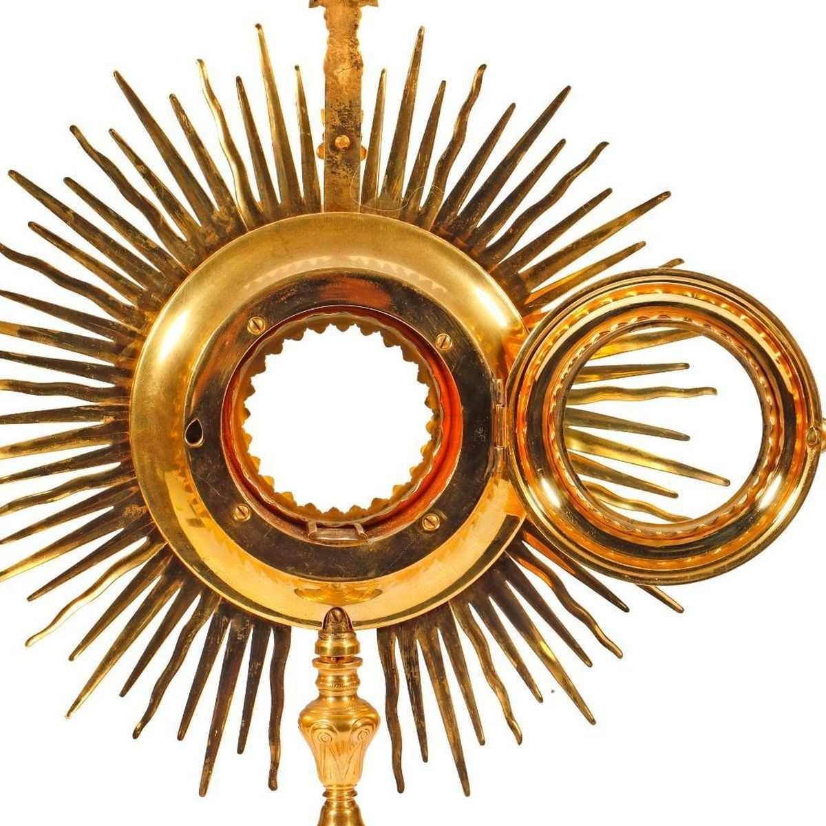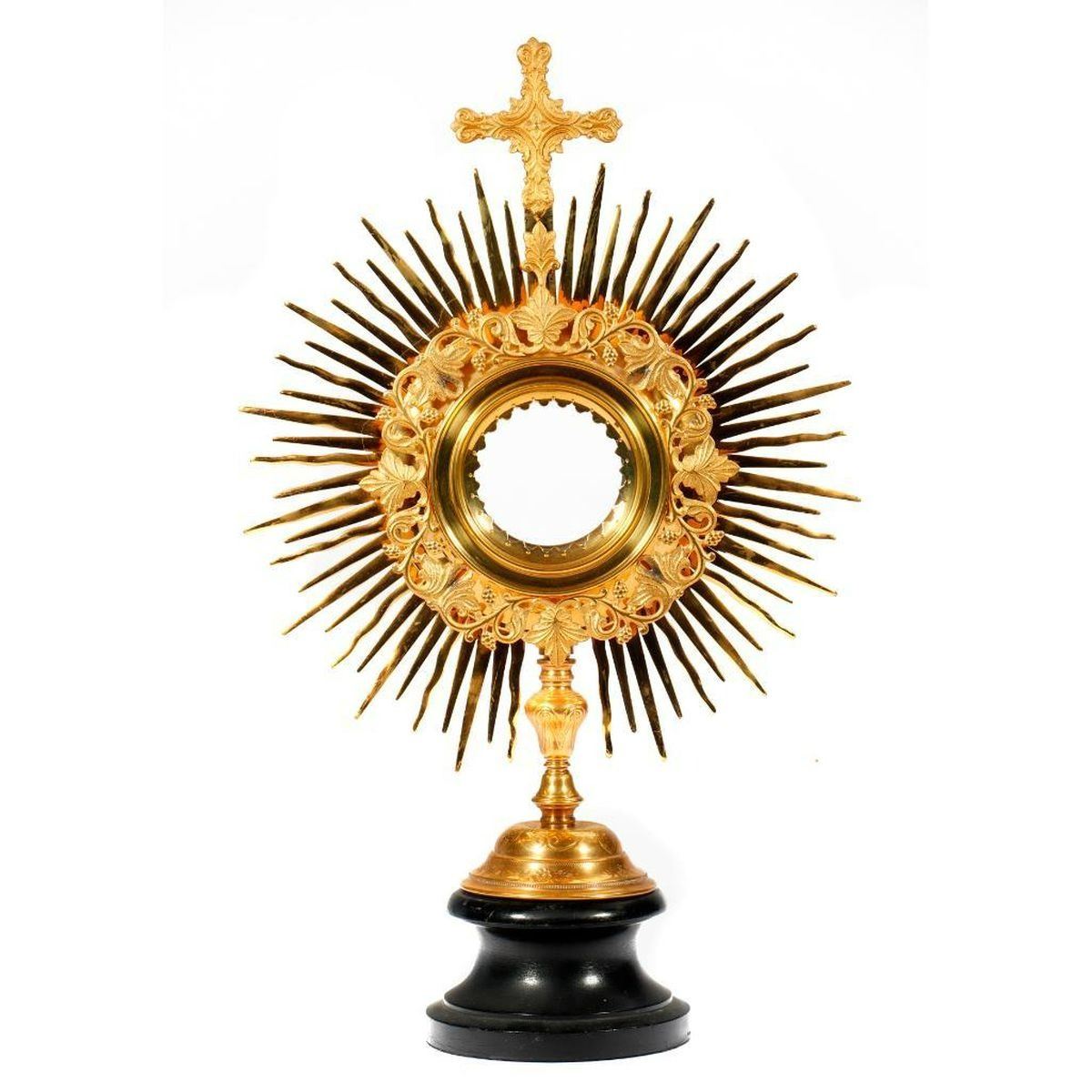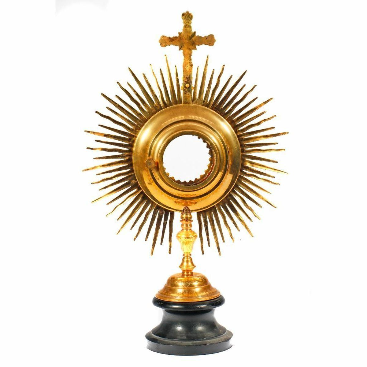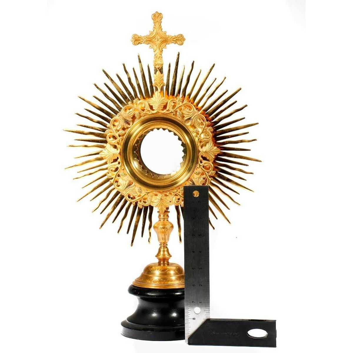 With a chased decorated stand mounted on an ebonized base. 20in. h. x 12in. w. Good condition; no lunette.