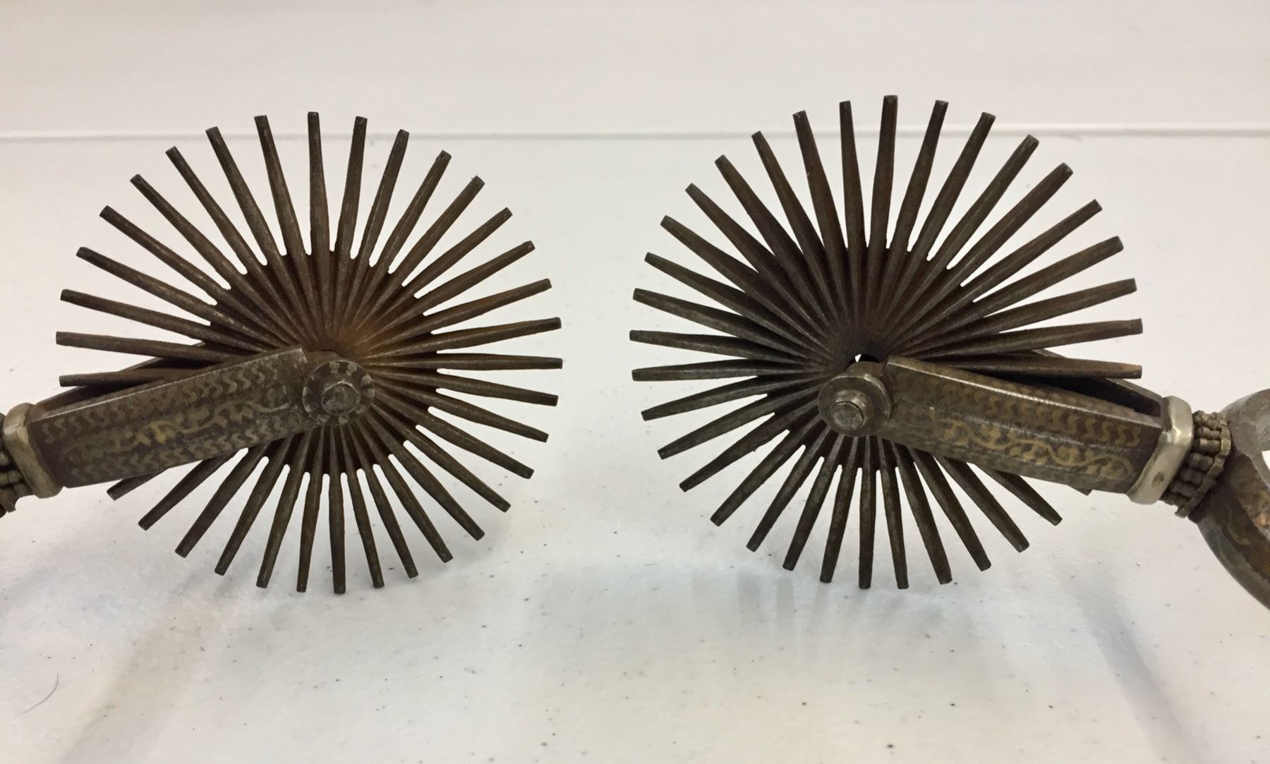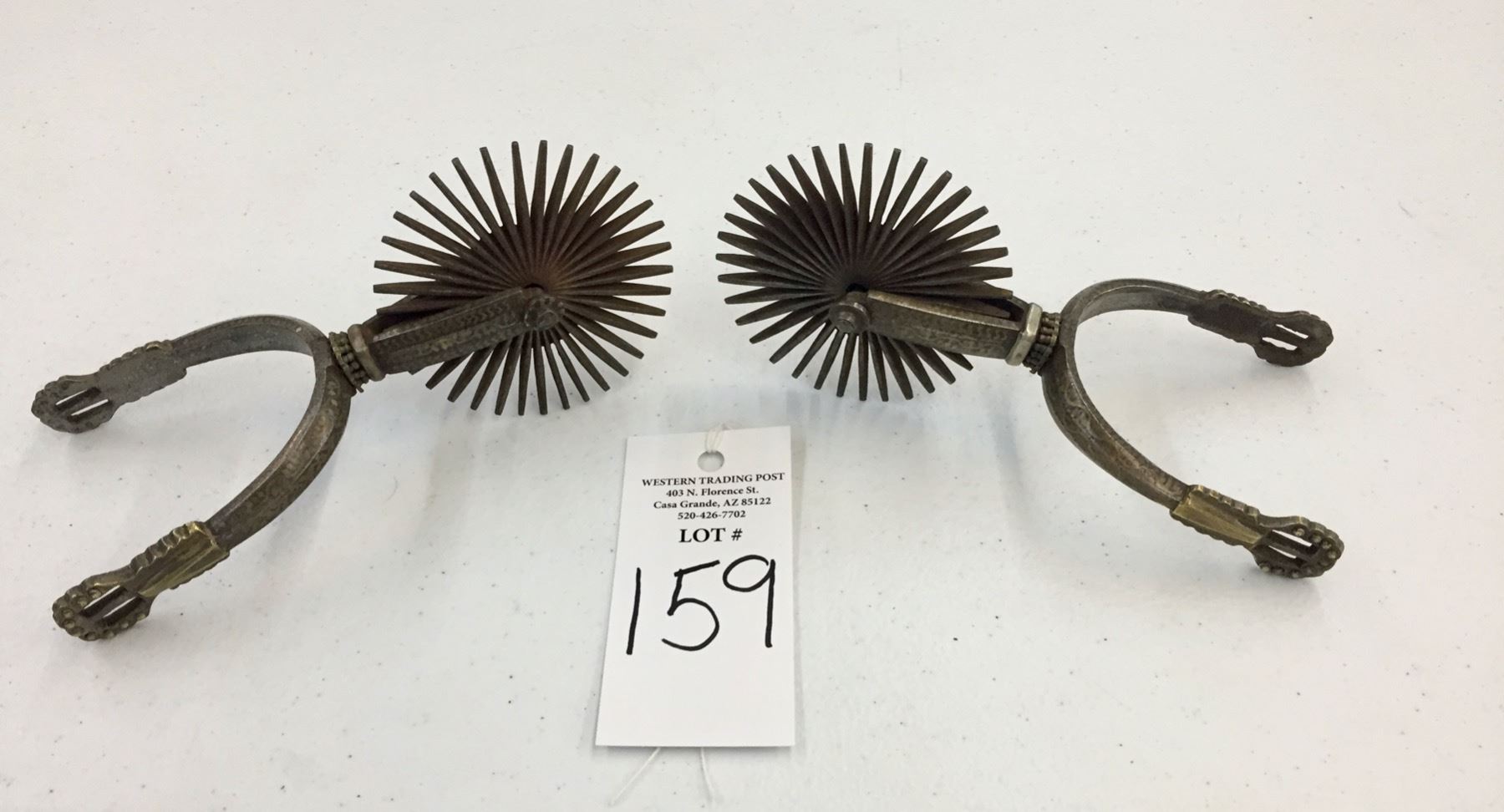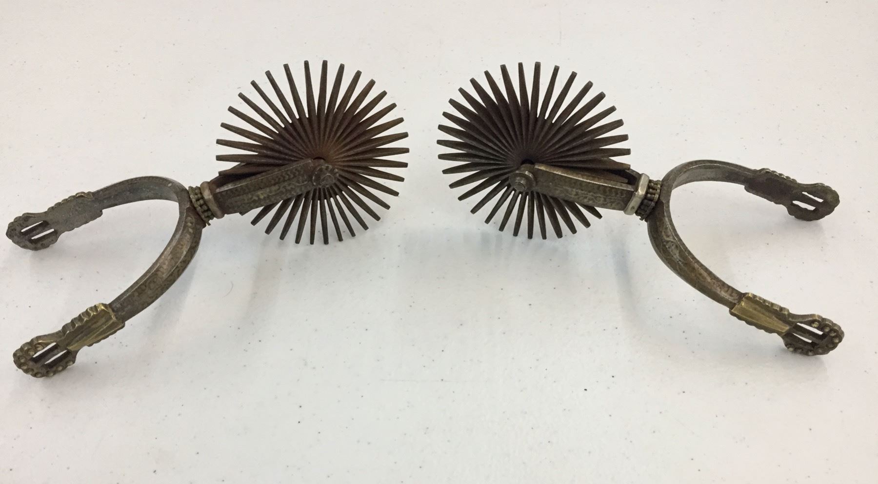 Description: Offered for sale in this lot is an ornate pair of Chilean spurs. This is a fancy pair of spurs with large rowels. Maker: Unknown. Approx. Age: Vintage. Size: 3†heel and 4†shank. Condition: Good for its age, normal wear expected. Please look closely at the pictures - they are an important part of our description. Shipping: There will be a $7 handling / packaging fee for shipping this lot. The actual cost of postage will be added on top of that.