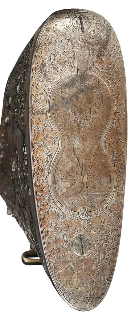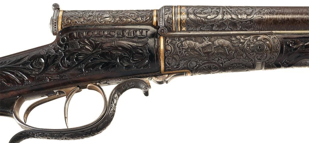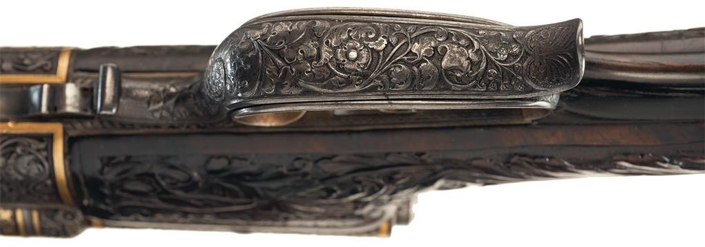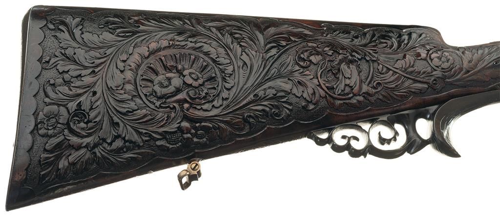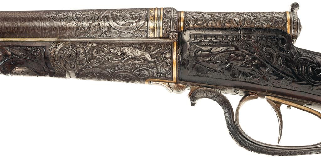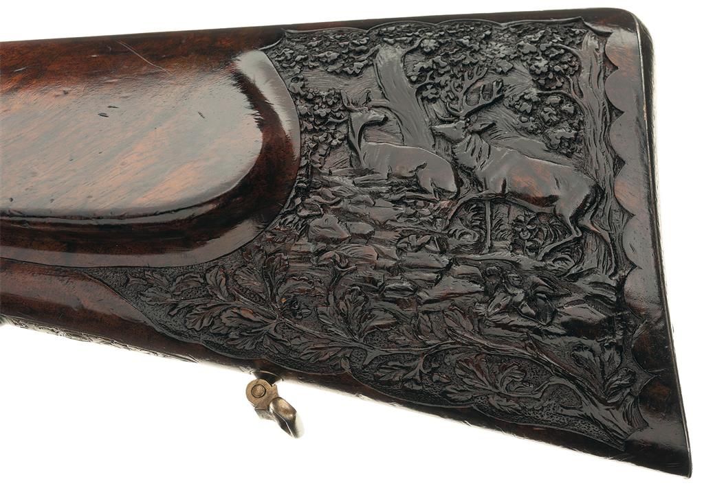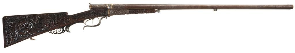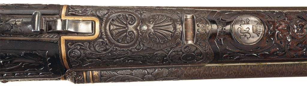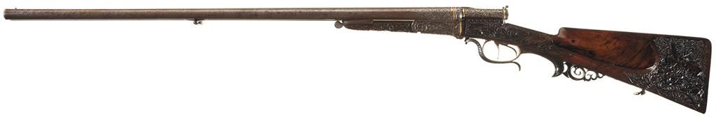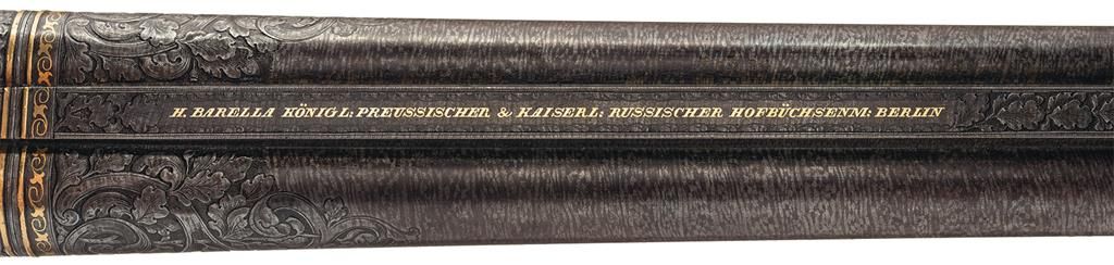 This is a beautiful example of a needle fire shotgun made by Heinrich Barella of Magdenburg, Germany. Barella was born in Soest, Germany, in 1819 and at the approximate age of 24, attained the level of Master Gunsmith. In 1844, he founded his firm H. Barella Gewehrfabrik in Magdeburg, Germany. In the mid 1860s he was a gunmaker to the Prussian Royal Court and in 1871, he was the gunmaker to the Royal Court in Berlin. Barella was reported to have had clients such as the King of Italy and Romania as well as the Tsar of Russia. Barella died in 1893. This shotgun features Damascus barrels with a solid rib and single brass bead sight. The breech end of the rib is gold inlaid "H. BARELLA HONIGL: PREUSSISCHER & KAISERL: RUSSISCHER HOFBUCHSENM: BERLIN" flanked by relief oak leaf engraving. The breech end of the barrels are relief engraved with a broad scroll and oak leaf design. There are two gold wire inlaid bands on the muzzles and one on the breech end as well as a decorative design on each end. The bottom of each barrel under the forearm are marked with the serial number "1539", "17.0" on the right barrel and an unrecognizable proof on the left. There is a sling swivel mounted on the bottom of the barrels. The receiver and under break lever are relief engraved with a floral scroll design and the rear portion of the forearm, (which is metal), has a scene of a hunting dog flushing a game bird on the left side and two deer on the right side. There are wide gold inlaid bands on the front and rear of the receiver and on the rear of the forearm. Double triggers with the forward trigger being a set trigger and a decorative horn grip extension. The forward wood portion of the forearm is carved with a floral vine design, as are the sides of the stock wrist and right side of the stock. The bottom of the forearm has a round silver initial plate which is engraved with a crown and inscribed "AK". With the crown, one can only suspect this shotgun was made for someone of royalty. The left side of the stock features a cheekpiece and a beautifully carved wooden scene of two deer. The iron buttplate is engraved with a floral vine design, there is a compartment for two shells, and the door is engraved with a buck in a field scene. The barrels have 2 1/2 inch chambers, choke at a loose cylinder and there is an extractor. 2 ½ inch chambers, bore diameter: R- .676 L- .676, bore constriction: R- .006 L- .000, length of pull: 14 5/8 inches, drop at comb: 1 7/16 inches, drop at heel: 2 5/16 inches, cast-off: ¼ inches, weight: 7lbs 15oz.