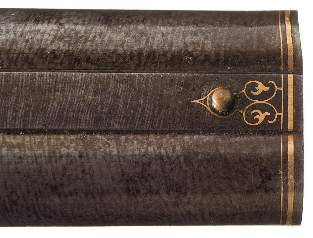 Fine. The barrels retain 20% of the original brown finish with 50% of the Damascus pattern remaining. The remaining metal surfaces have a smooth gray patina. At some time a protective coating has been put on the metal surfaces and there is still some residue remaining in areas, mainly protected areas. The wood is very fine with a few small minor dents on the cheekpiece. The engraving and carving remain sharp. All of the gold inlay remains. Mechanically excellent.