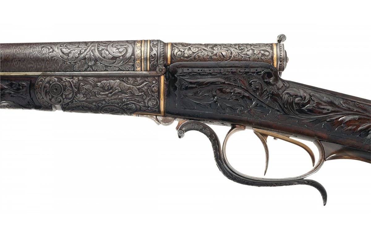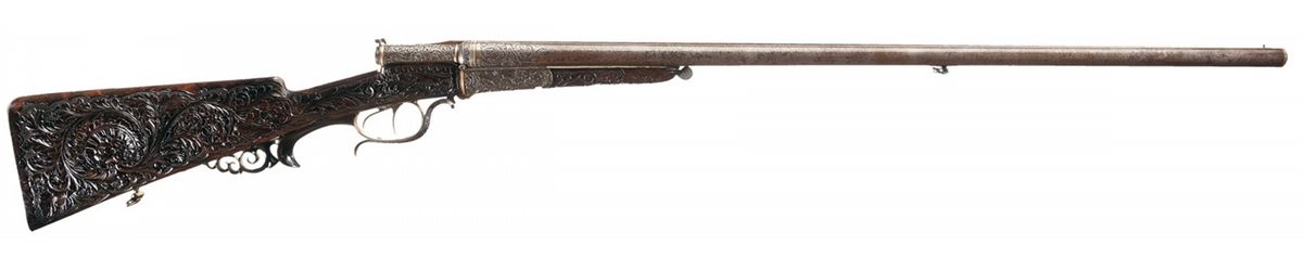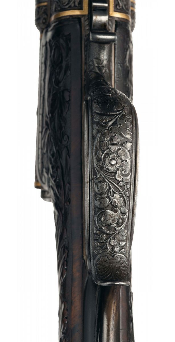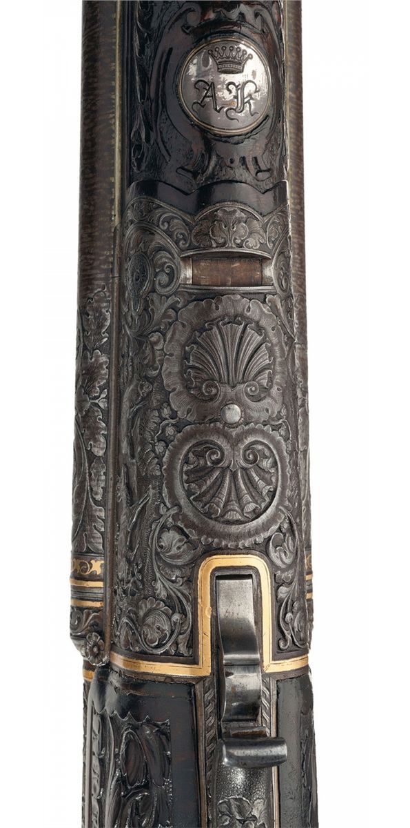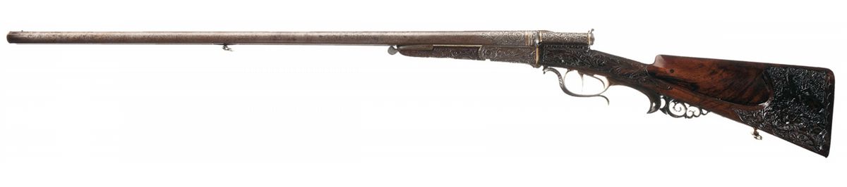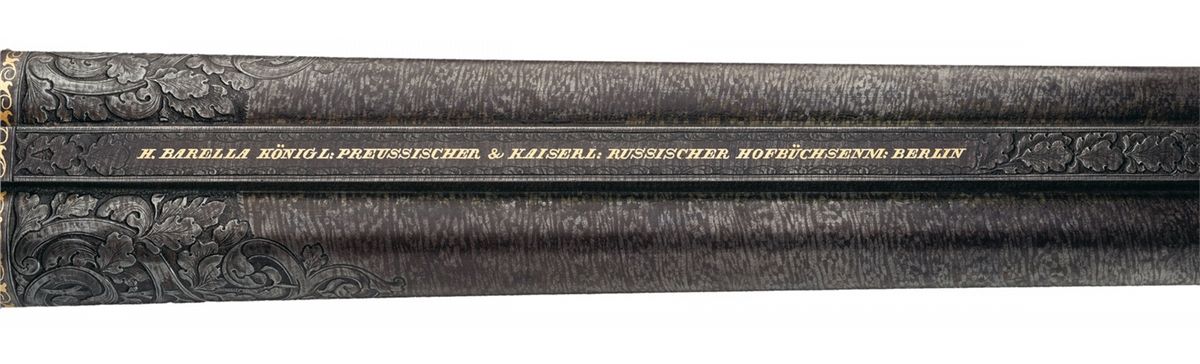 This is a beautiful example of a needle fire shotgun made by Heinrich Barella of Magdenburg, Germany. Barella was born in Soest, Germany in 1819 and at the approximate age of 24 attained the level of Master Gunsmith. In 1844 he founded his firm H. Barella Gewehrfabrik in Magdeburg, Germany. In the mid 1860s he was a gunmaker to the Prussian Royal Court and in 1871 he was the gunmaker to the Royal Court in Berlin. Barella was purported to have had clients such as the King of Italy and Romania as well as the Tsar of Russia. Barella died in 1893. This shotgun features Damascus barrels with a solid rib and single brass bead sight. The breech end of the rib is gold inlaid "H. BARELLA HONIGL: PREUSSISCHER & KAISERL: RUSSISCHER HOFBUCHSENM: BERLIN" flanked by relief oak leaf engraving. The breech end of the barrels is relief engraved with a broad scroll and oak leaf design. There are two gold wire inlaid bands on the muzzles and one on the breech end as well as a decorative design on each end. The bottom of each barrel under the forearm are marked with the serial number "1539", "17.0" on the right barrel and an unrecognizable proof on the left. There is a sling swivel mounted on the bottom of the barrels.The receiver and under break lever are relief engraved with a floral scroll design and the rear portion of the forearm, (which is metal), has a scene of a hunting dog flushing a game bird on the left side and two deer on the right side. There are wide gold inlaid bands on the front and rear of the receiver and on the rear of the forearm. Double triggers with the forward trigger being a set trigger and a decorative horn grip extension. The forward wood portion of the forearm is carved with a floral vine design, as are the sides of the stock wrist and right side of the stock. The bottom of the forearm has a round silver initial plate which is engraved with a crown and inscribed "AK". With the crown one can only suspect this shotgun was made for someone of royalty. The left side of the stock features a cheek piece and a beautifully carved wooden scene of two deer. The iron buttplate is engraved with a floral vine design and there is a compartment for two shells, and the door is engraved with a buck in a field scene. The barrels have 2 1/2 inch chambers, choke at a loose cylinder and there is an extractor. Length of pull is 14 1/2 inches.