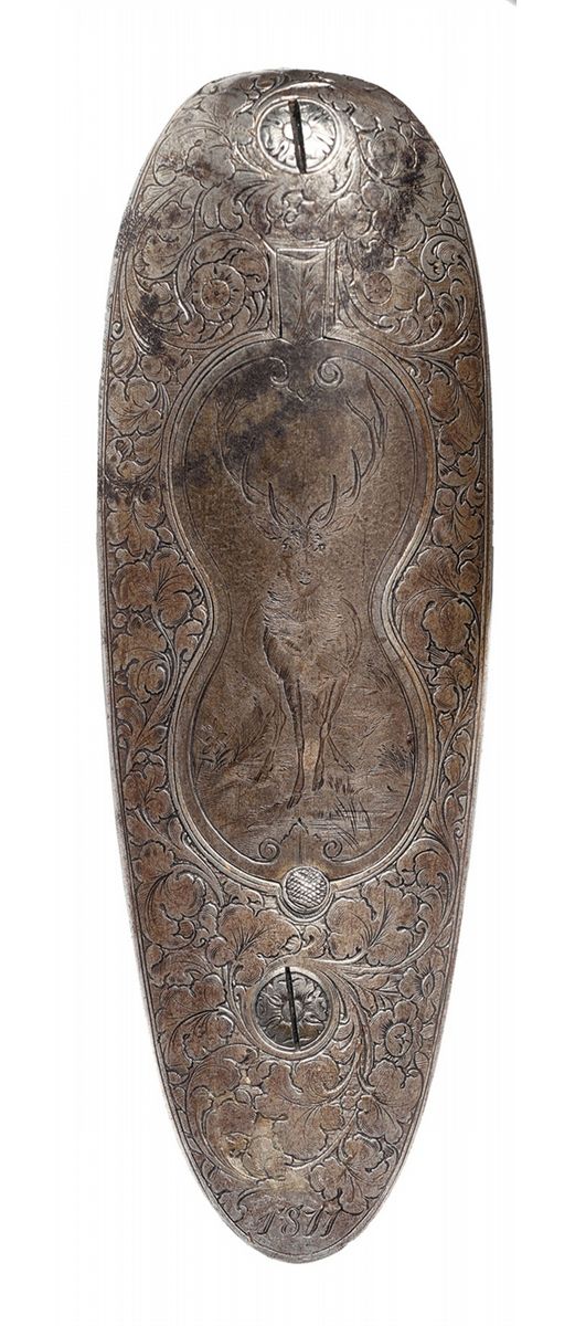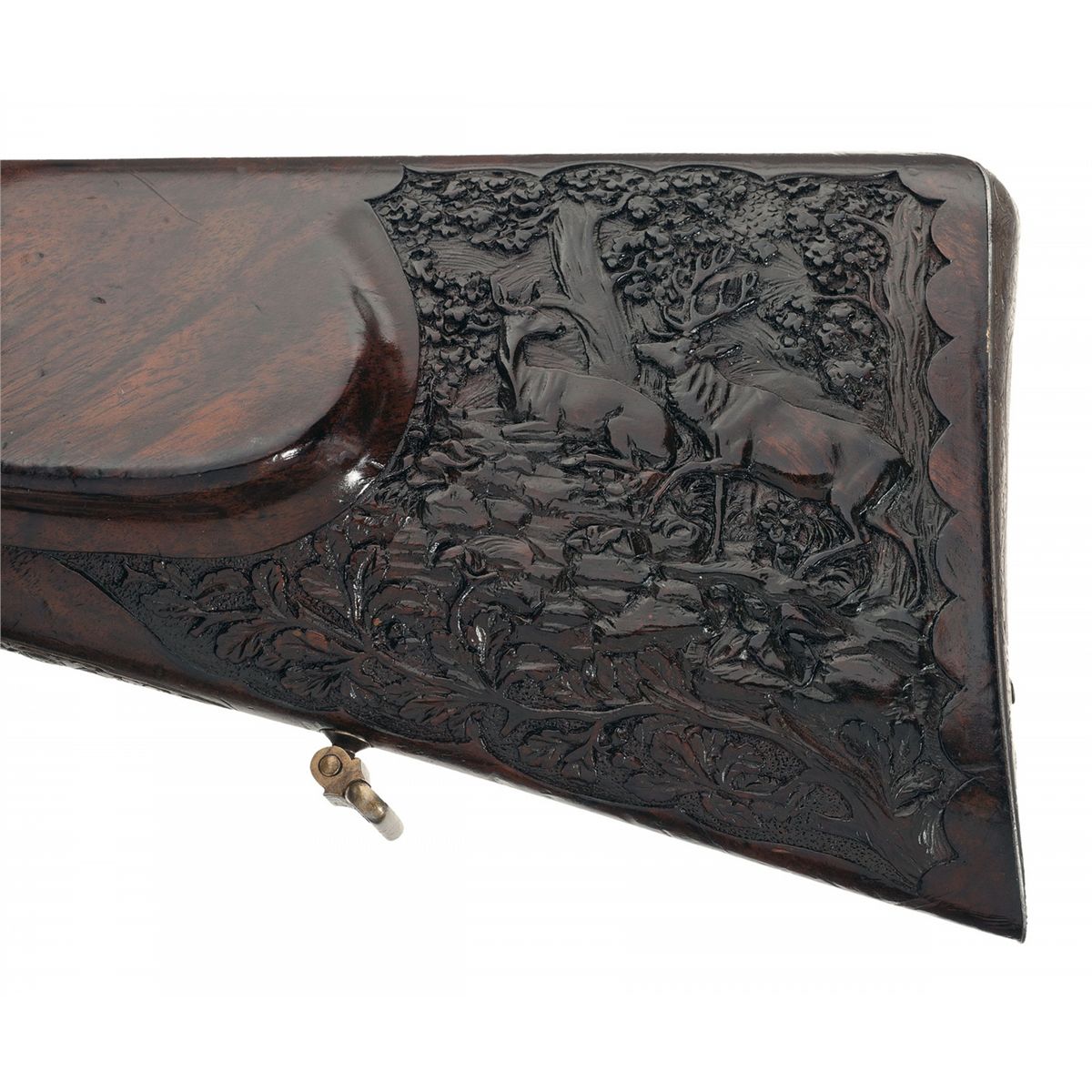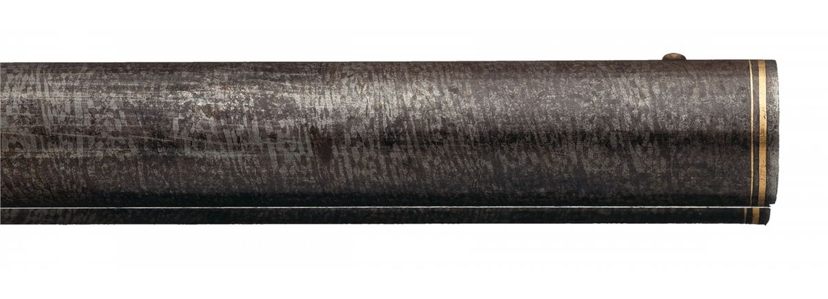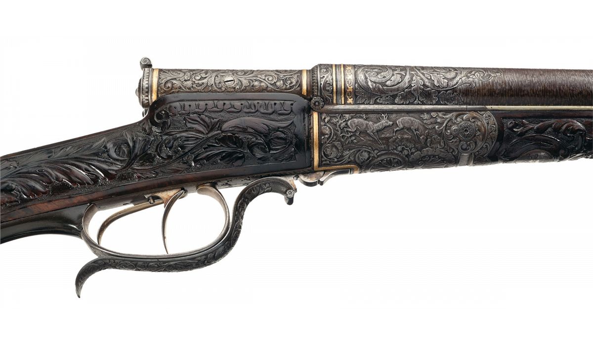 This is a beautiful example of a needle fire shotgun made by Heinrich Barella of Magdenburg, Germany. Barella was born in Soest, Germany in 1819 and at the approximate age of 24 attained the level of Master Gunsmith. In 1844 he founded his firm H. Barella Gewehrfabrik in Magdeburg, Germany. In the mid 1860s he was a gunmaker to the Prussian Royal Court and in 1871 he was the gunmaker to the Royal Court in Berlin. Barella was purported to have had clients such as the King of Italy and Romania as well as the Tsar of Russia. Barella died in 1893. This shotgun features Damascus barrels with a solid rib and single brass bead sight. The breech end of the rib is gold inlaid "H. BARELLA HONIGL: PREUSSISCHER & KAISERL: RUSSISCHER HOFBUCHSENM: BERLIN" flanked by relief oak leaf engraving. The breech end of the barrels is relief engraved with a broad scroll and oak leaf design. There are two gold wire inlaid bands on the muzzles and one on the breech end as well as a decorative design on each end. The bottom of each barrel under the forearm are marked with the serial number "1539", "17.0" on the right barrel and an unrecognizable proof on the left. There is a sling swivel mounted on the bottom of the barrels.The receiver and under break lever are relief engraved with a floral scroll design and the rear portion of the forearm, (which is metal), has a scene of a hunting dog flushing a game bird on the left side and two deer on the right side. There are wide gold inlaid bands on the front and rear of the receiver and on the rear of the forearm. Double triggers with the forward trigger being a set trigger and a decorative horn grip extension. The forward wood portion of the forearm is carved with a floral vine design, as are the sides of the stock wrist and right side of the stock. The bottom of the forearm has a round silver initial plate which is engraved with a crown and inscribed "AK". With the crown one can only suspect this shotgun was made for someone of royalty. The left side of the stock features a cheek piece and a beautifully carved wooden scene of two deer. The iron buttplate is engraved with a floral vine design and there is a compartment for two shells, and the door is engraved with a buck in a field scene. The barrels have 2 1/2 inch chambers, choke at a loose cylinder and there is an extractor. Length of pull is 14 1/2 inches.