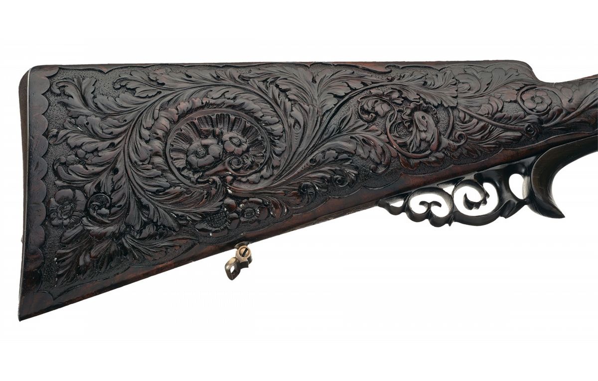 Condition: Fine. The barrels retain 20% of the original brown finish with 50% of the Damascus finish remaining. The remaining metal surfaces have a smooth gray patina. At some time a protective coating has been put on the metal surfaces and there is still some residue remaining in areas, mainly protected areas. The wood is very fine with a few small minor dents on the cheek piece. The engraving and carving remain sharp. All of the gold inlay remains. Mechanically excellent.