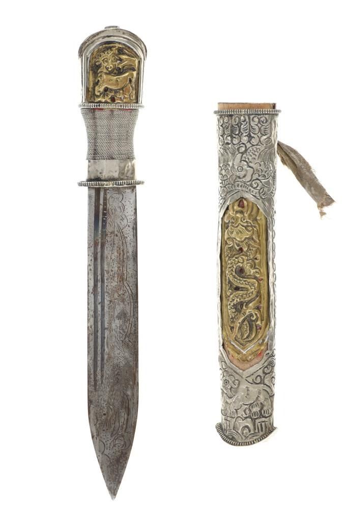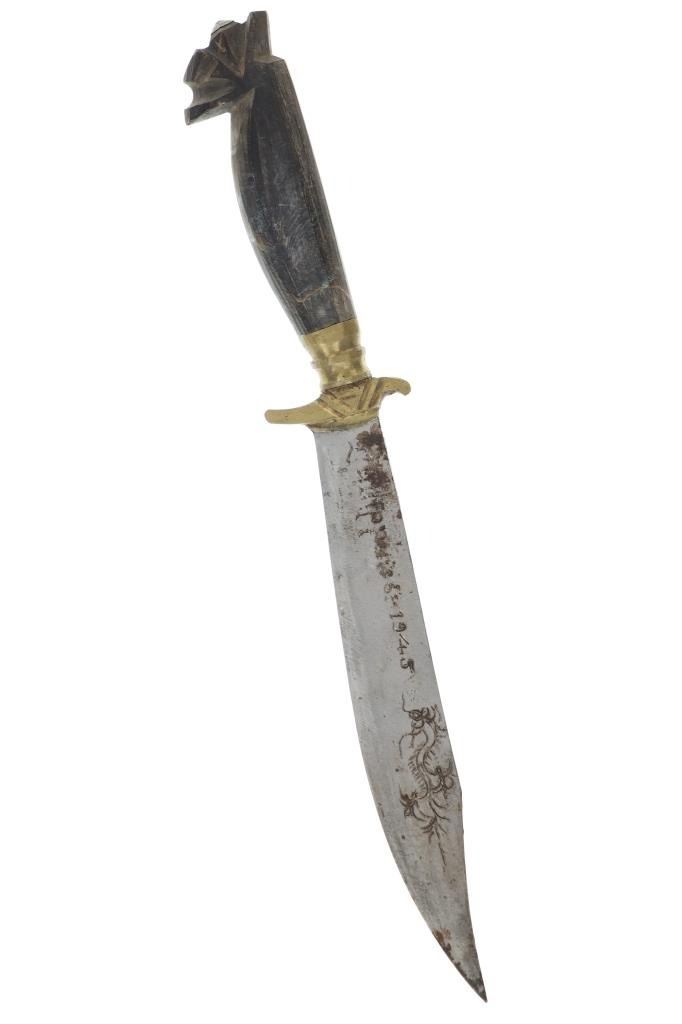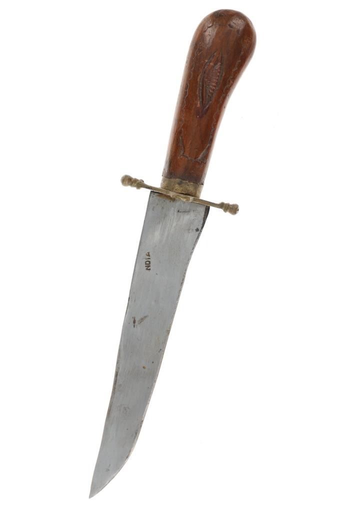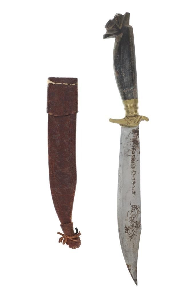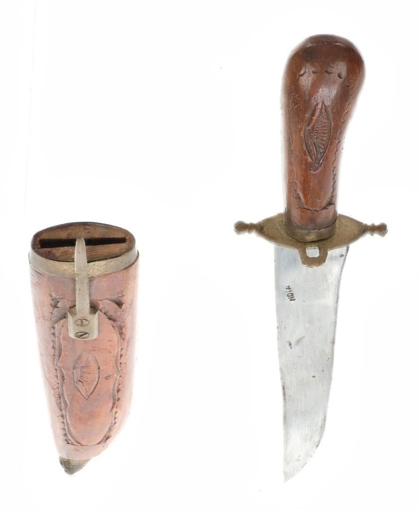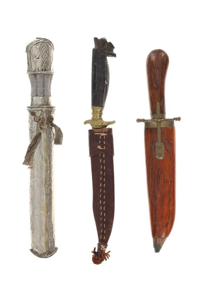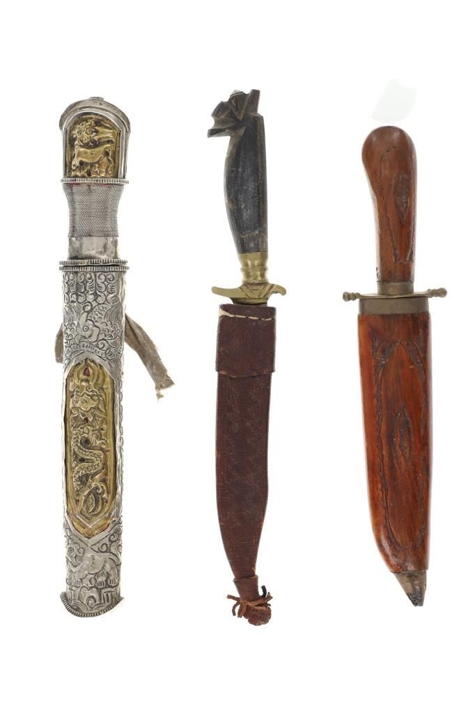 Featured in this lot is an ornate ethnographic fixed blade knife collection. The knives feature a wonderfully and professionally crafted construction with three knives in the collection. The first is a knife from India with a wooden handle and a wood and brass sheath with a locking mechanism, and the knife is marked 'India.' The second knife is a Filipino knife in a leather sheath with a curved blade and is marked "Philippines - 1945." The third knife a Far East ornate Tanto knife with a pot metal and brass sheath with decoration to the outside sheath and pommel and an etching of a dragon on the blade. The condition of this collection of is fair with some oxidation to the blades and to the sheaths with some patina to the oriental blade but otherwise shows fair overall condition. The measurements of these knives rage from 10 1/4" x 2 1/4" to 11 1/2" x 1 1/2". The collective weight of these knives is 1lb.*
