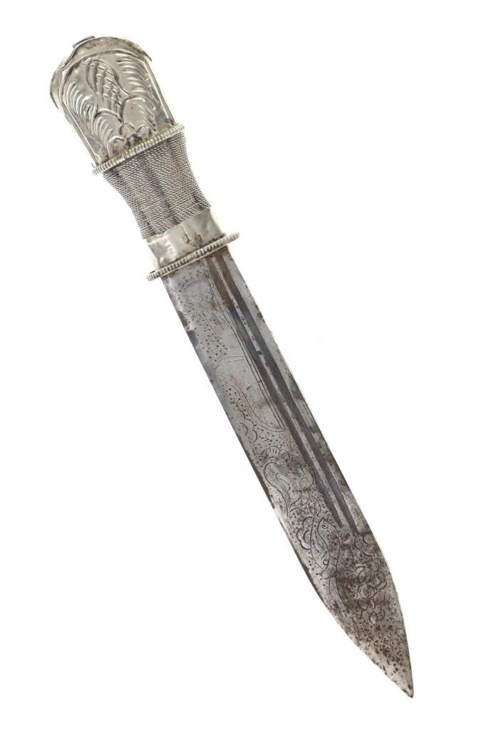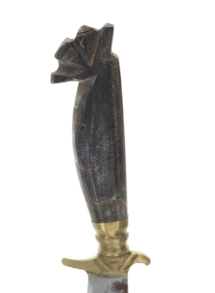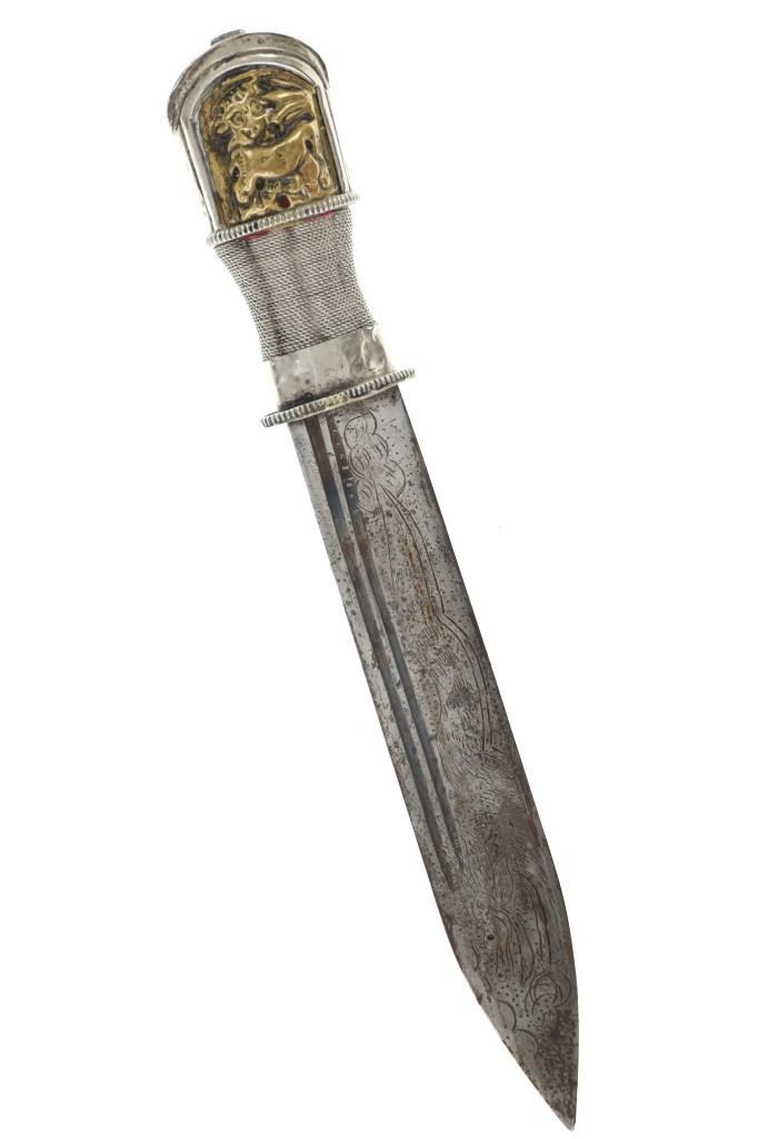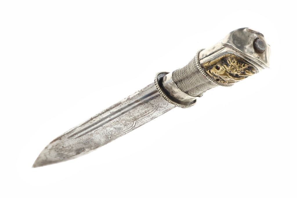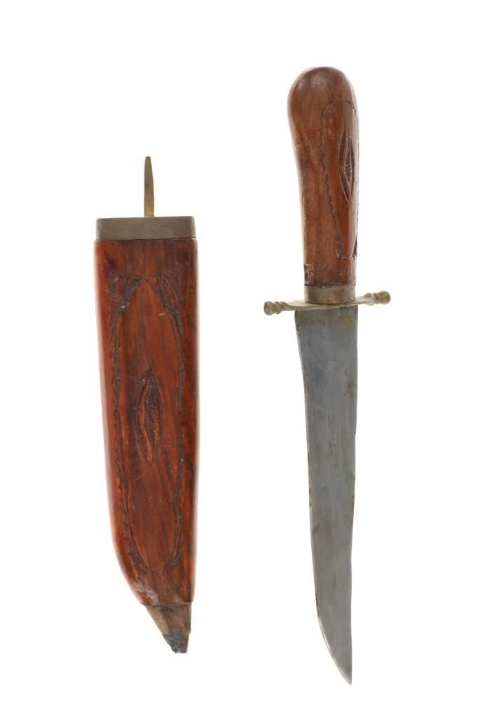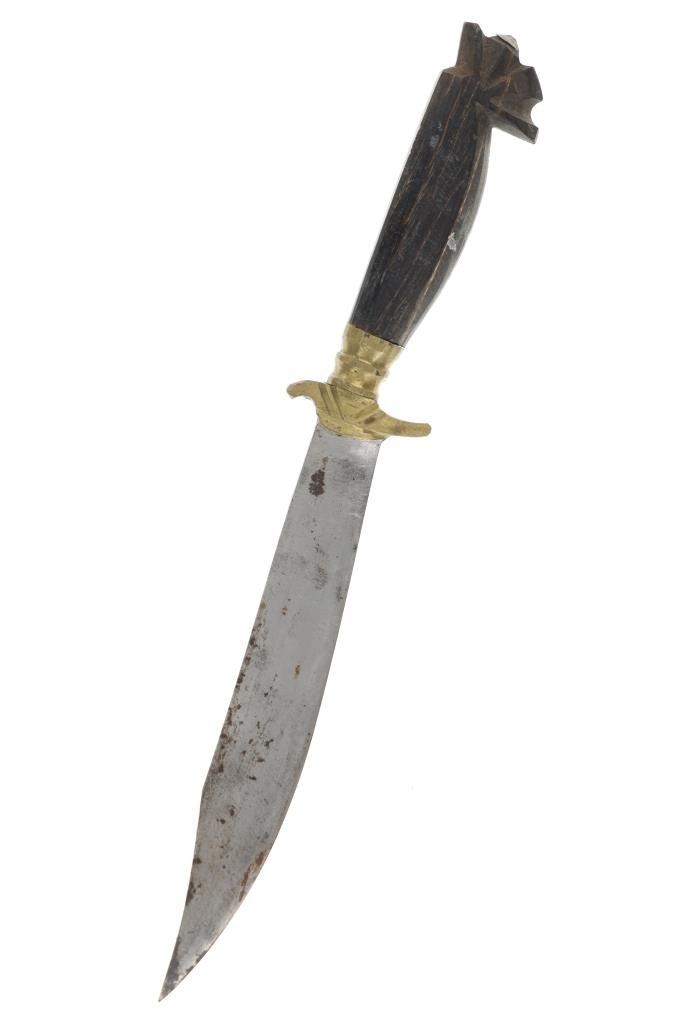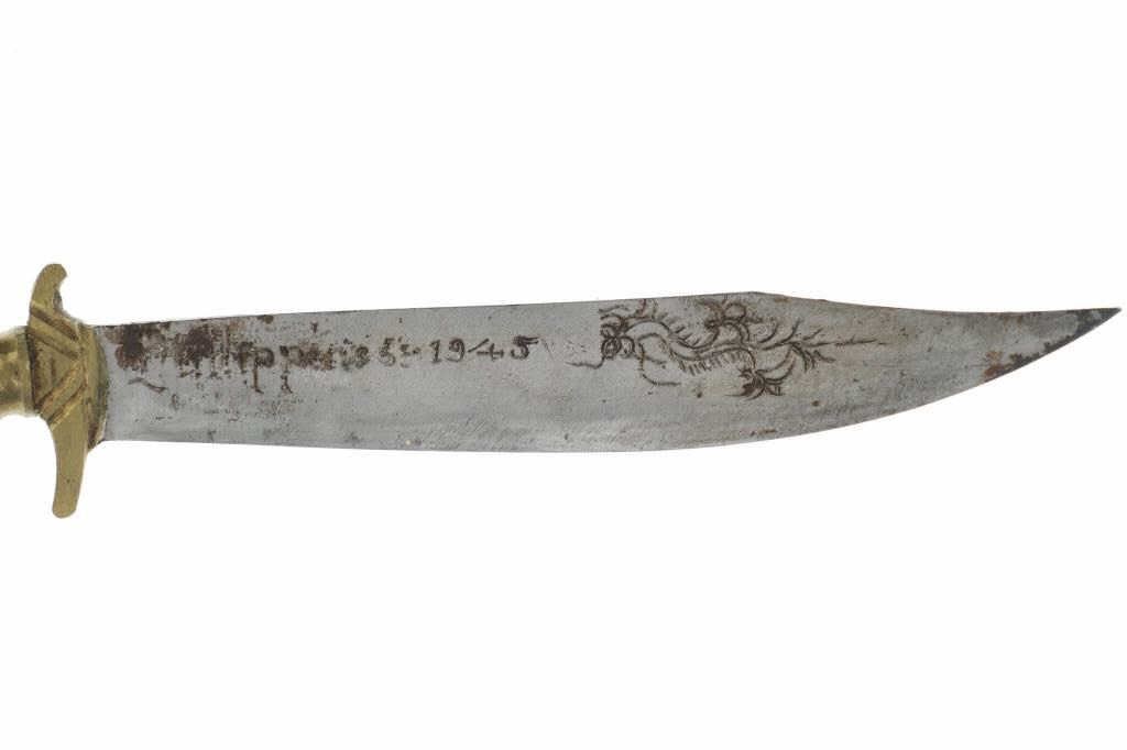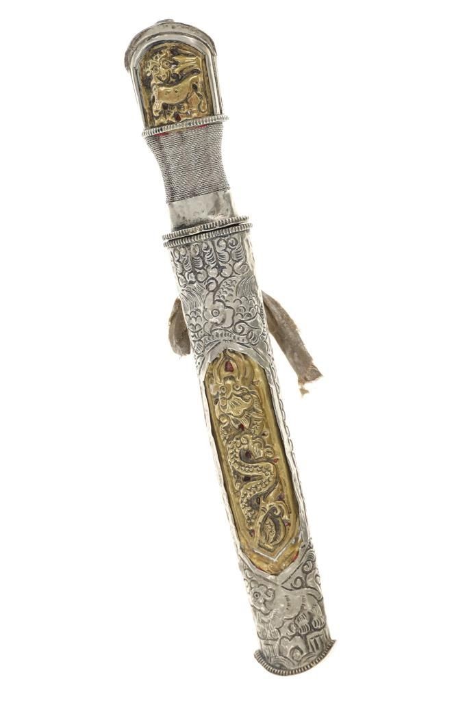 Featured in this lot is an ornate ethnographic fixed blade knife collection. The knives feature a wonderfully and professionally crafted construction with three knives in the collection. The first is a knife from India with a wooden handle and a wood and brass sheath with a locking mechanism, and the knife is marked 'India.' The second knife is a Filipino knife in a leather sheath with a curved blade and is marked "Philippines - 1945." The third knife a Far East ornate Tanto knife with a pot metal and brass sheath with decoration to the outside sheath and pommel and an etching of a dragon on the blade. The condition of this collection of is fair with some oxidation to the blades and to the sheaths with some patina to the oriental blade but otherwise shows fair overall condition. The measurements of these knives rage from 10 1/4" x 2 1/4" to 11 1/2" x 1 1/2". The collective weight of these knives is 1lb.*