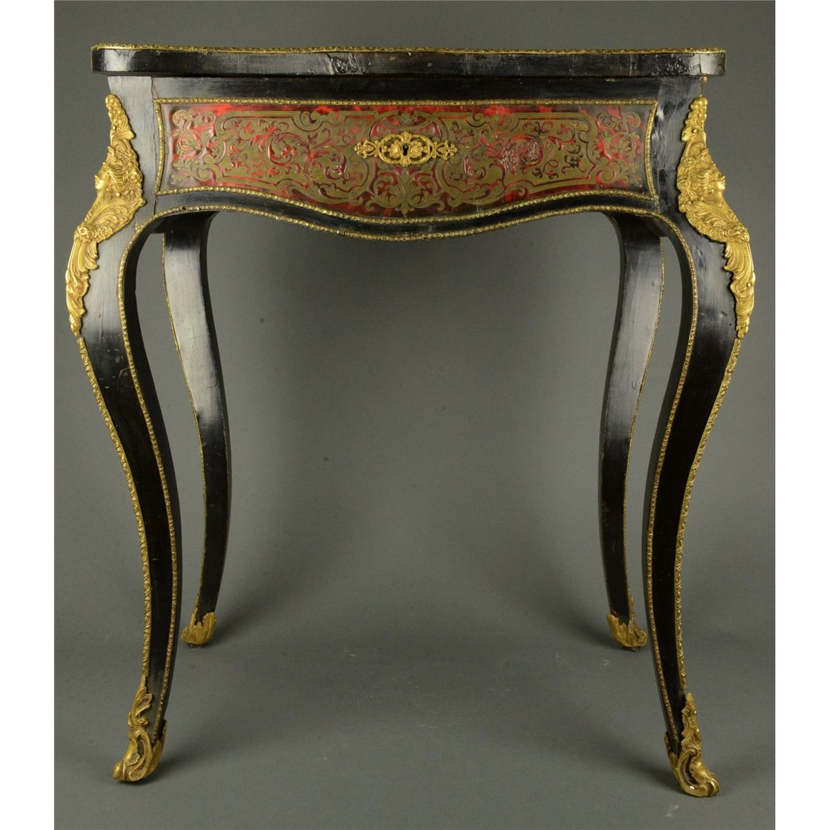 Beautiful and highly ornate French powder table with intricate bronze and boulle inlay and mounting carved ladies' head. Top opens with carved brass hinges, with mirror inside. 75 cm x 61 cm x 43 cm.