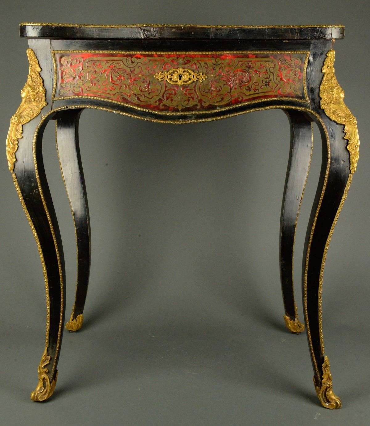 Beautiful and highly ornate French powder table with intricate bronze and boulle inlay and mounting carved ladies' head. Top opens with carved brass hinges, with mirror inside. 75 x 61 x 43 cm