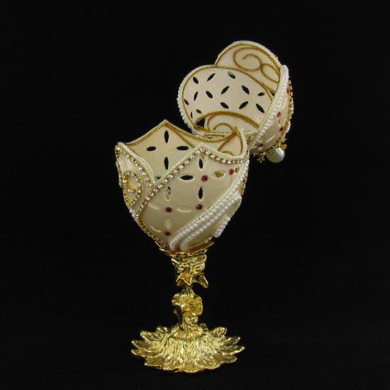 Excellent museum quality Faberge style; ornately hand-decorated with crystal and 24k gold plated adornments; silk lined; 6.5"; $995 retail