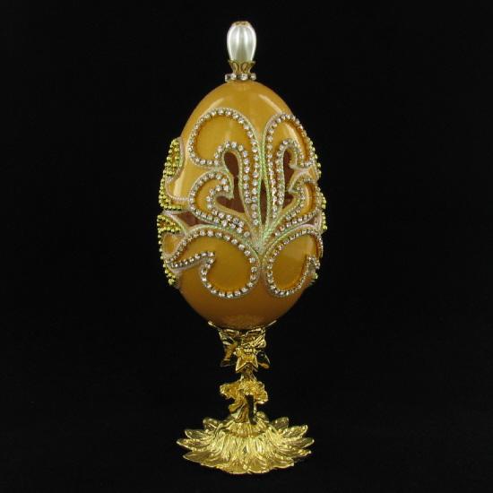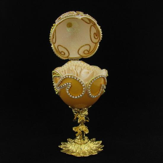 Excellent museum quality Faberge style; ornately hand-decorated with crystal and 24k gold plated adornments; silk lined; 6.5";