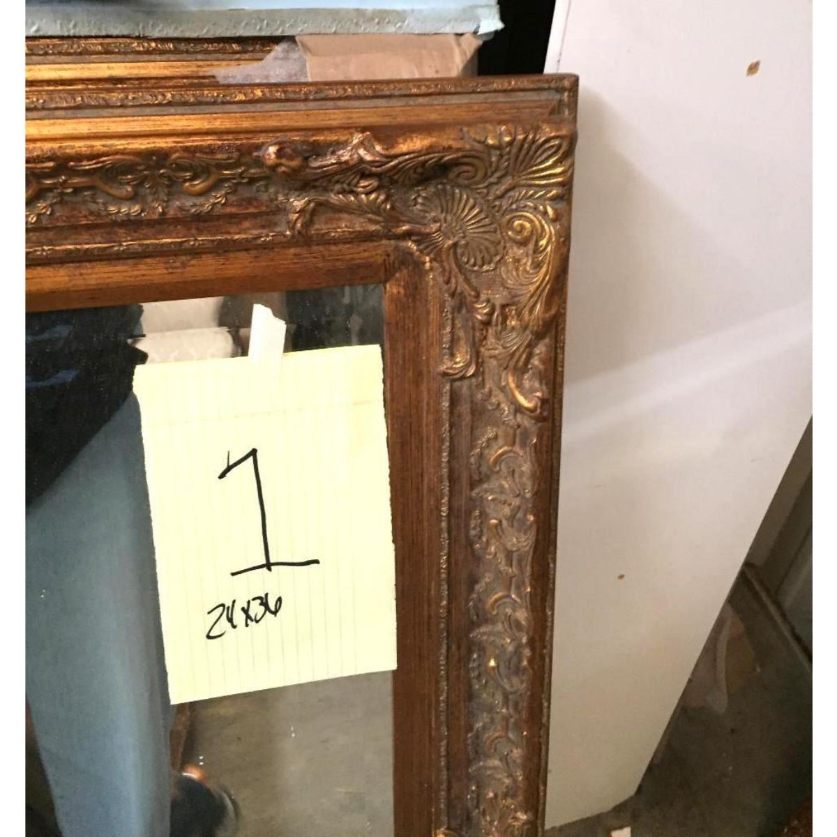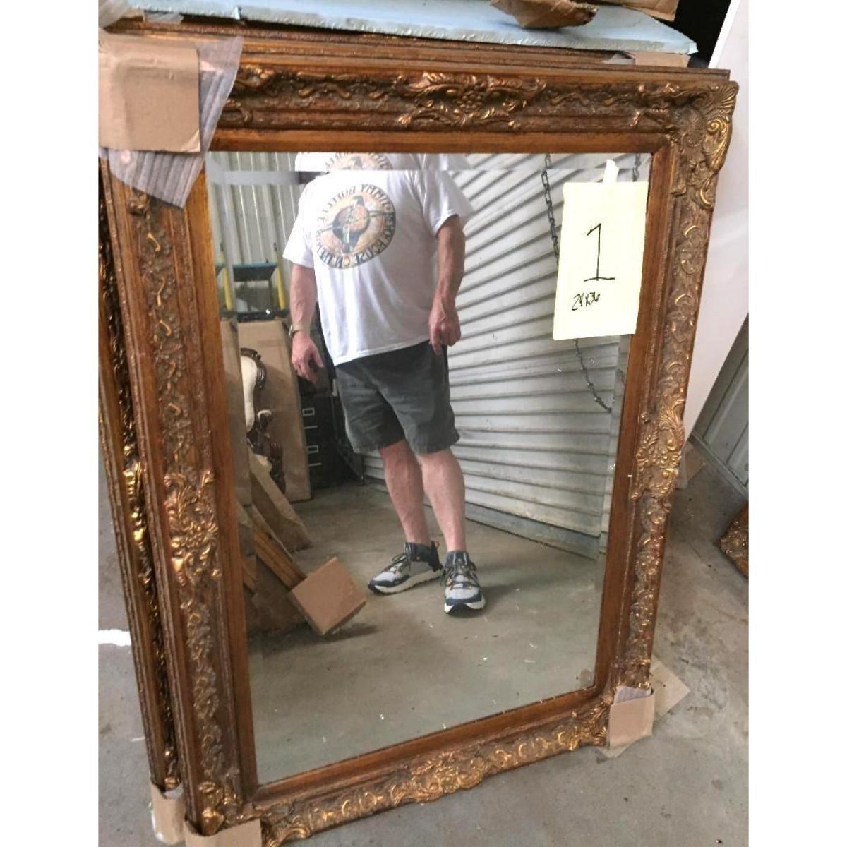 Gold gilt over ornate hand-carved solid wood frame with 24"x 36" beveled mirror glass. Overall size 32" x 44". *** this is a heavy weight item requiring special shipping delivery arrangements.
