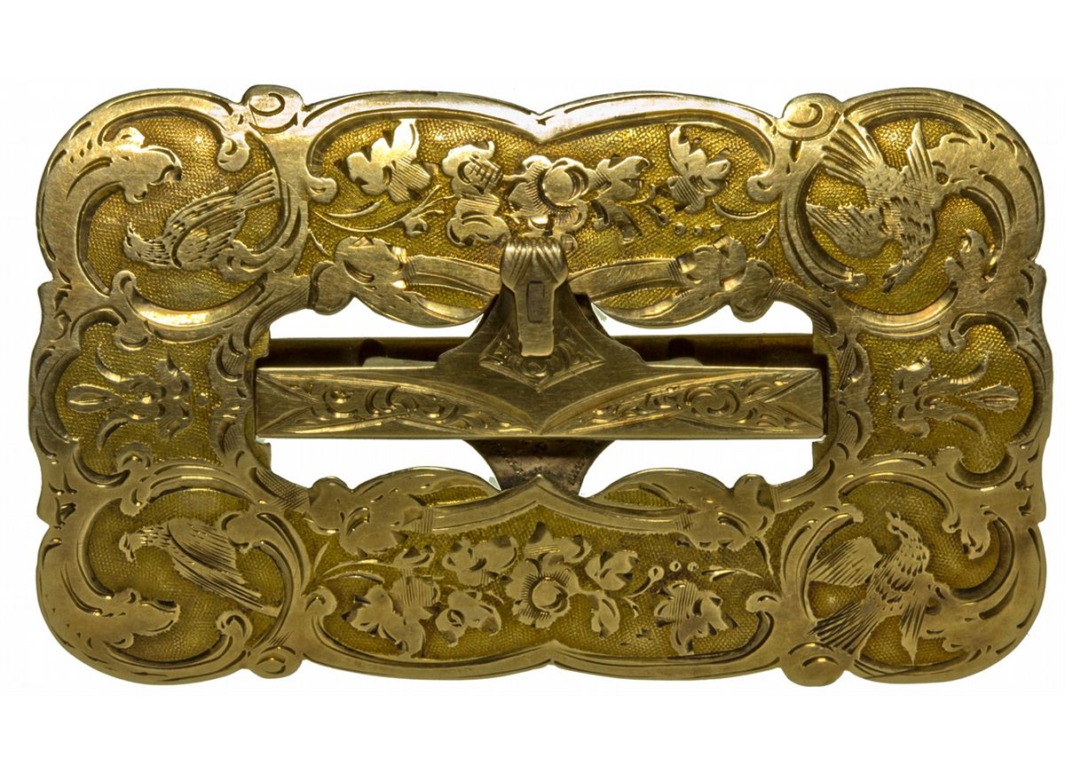 Beautifully etched metal buckle with birds in each corner and a swiveling clasp. 2.25x 1.25. HKA#62668