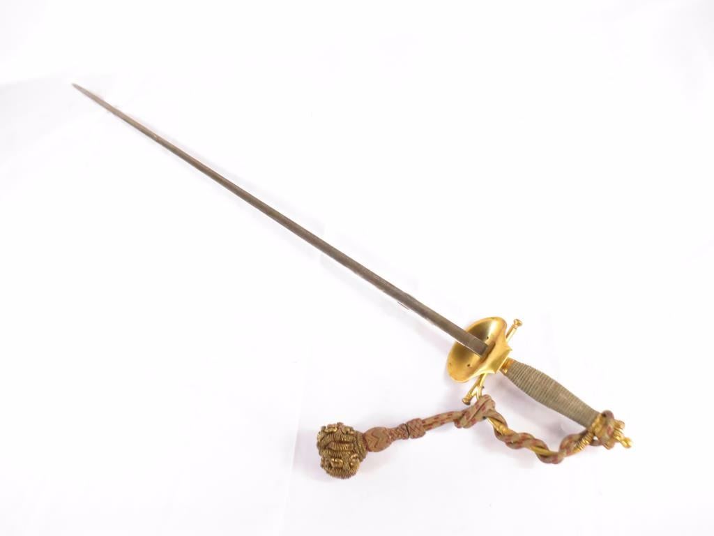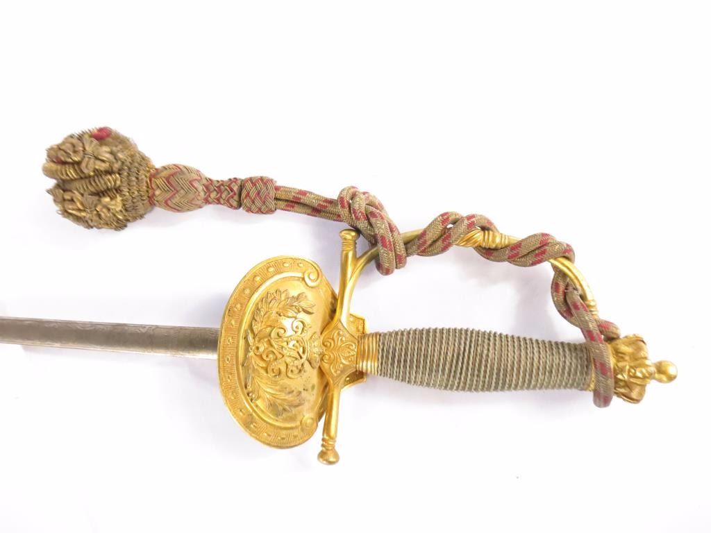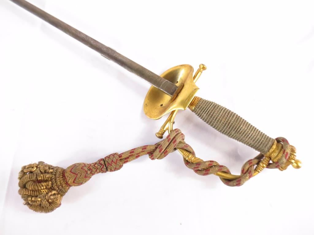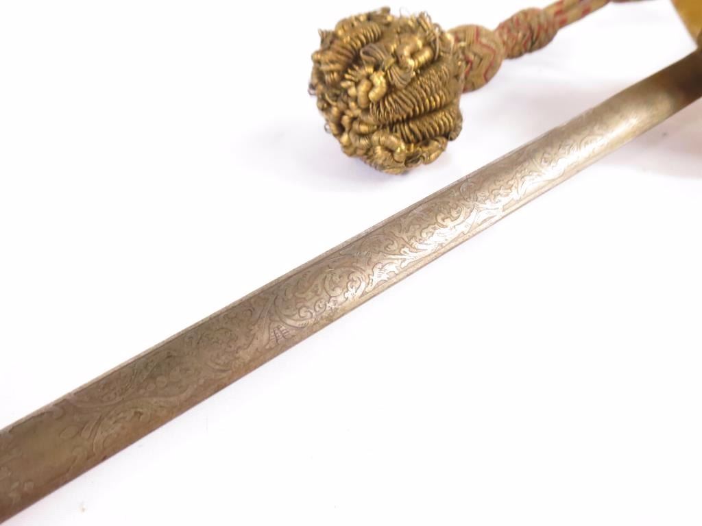 with the cypher of Queen Victoria on the counter guard. Silver wire-bound grip, silver bullion sword knot. Etched 31" blade with a London Makers name. There is no scabbard. Good looking and in very good condition.