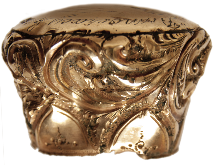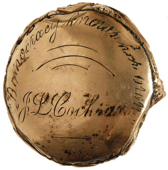 c. 1868 Grant v Seymour Presidential Election Period, Ornate & Identified Political Gold Gilt Cane Top, Inscribed “Democracy Knows Her Own” to “J L Cochran,” Very Fine.