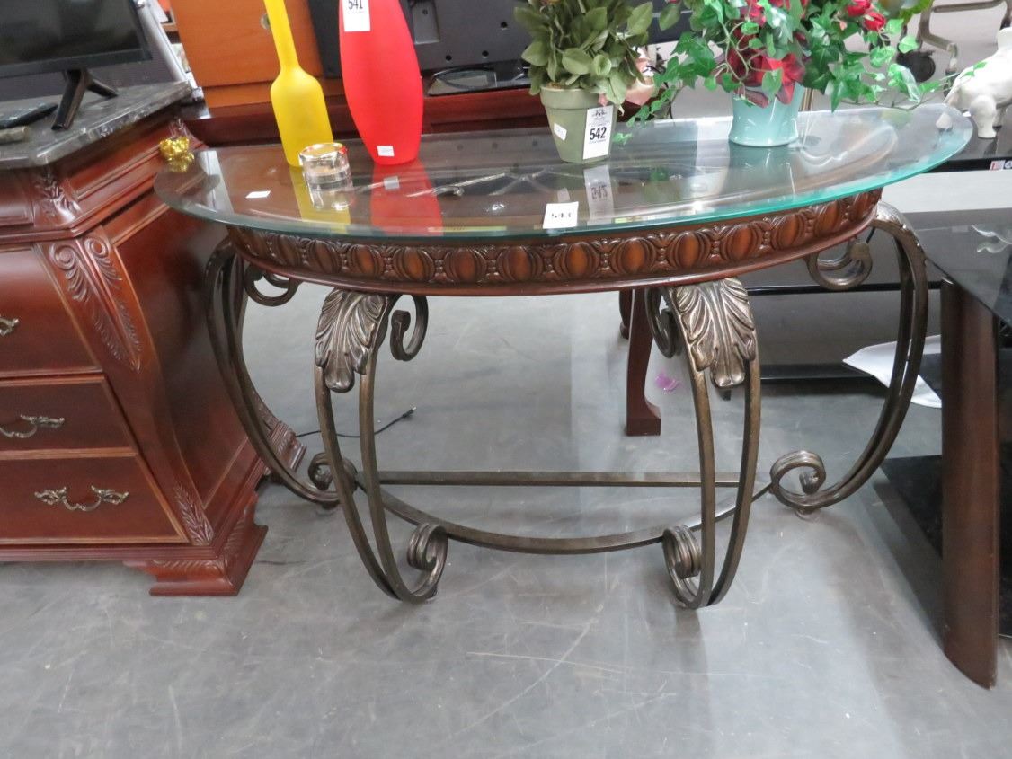 Ornate Metal Base Glasstop Half Moon Hall Table