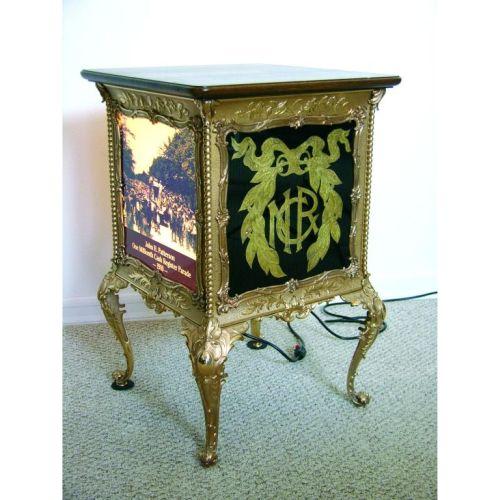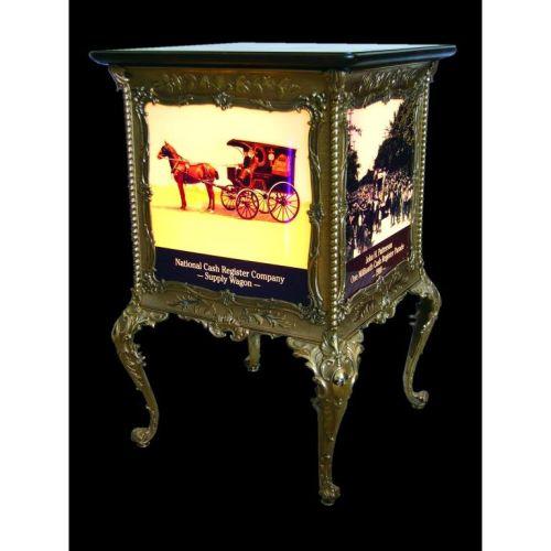 Ornate National Cash Register Stand that was specially designed for the 1893 Worlds Fair. NCR had an original in their Archives Department and commissioned Sam Robins to reproduce a few for their use and allowed him to make a small number for himself. These are very fancy and illuminate to show various factory scenes etc. on all four sides. The photos are from NCRs extensive collection of glass slides which are highly prized as historical artifacts. Only a few of these remanufactured stands exist today and are highly sought after by collectors. Excellent condition. Approx. 21 inches square and 31 inches tall