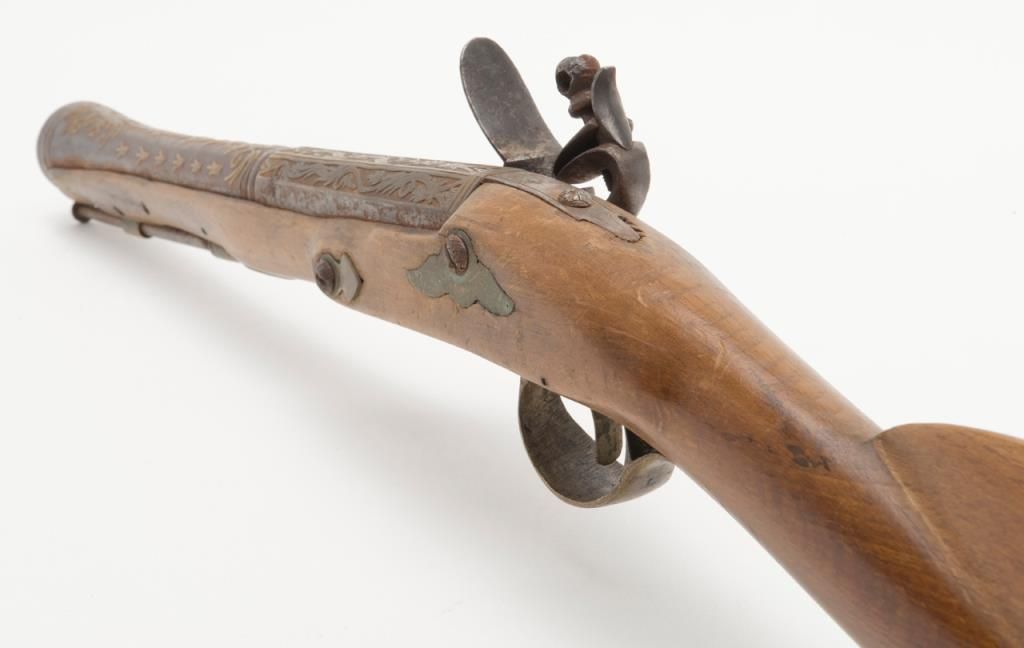 Ornate Oriental flintlock blunderbuss approx. 22-1/2” overall with highly decorated barrel, engraved lockplate and hammer, brass mounted, wood stock, un-cleaned and in “out-of-the-attic” condition; scattered surface rust, considerablegold wash remaining on decoration of barrel, visible original case colors on lockplate, crisp action; wood shows staining and cracks at forend area; the lower portion of the butt stock area has separated horizontally but is retained by thebrass butt plate and can be repaired; An early piece worthy of proper restoration. Est.: $700-$1,400.