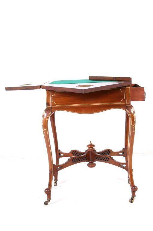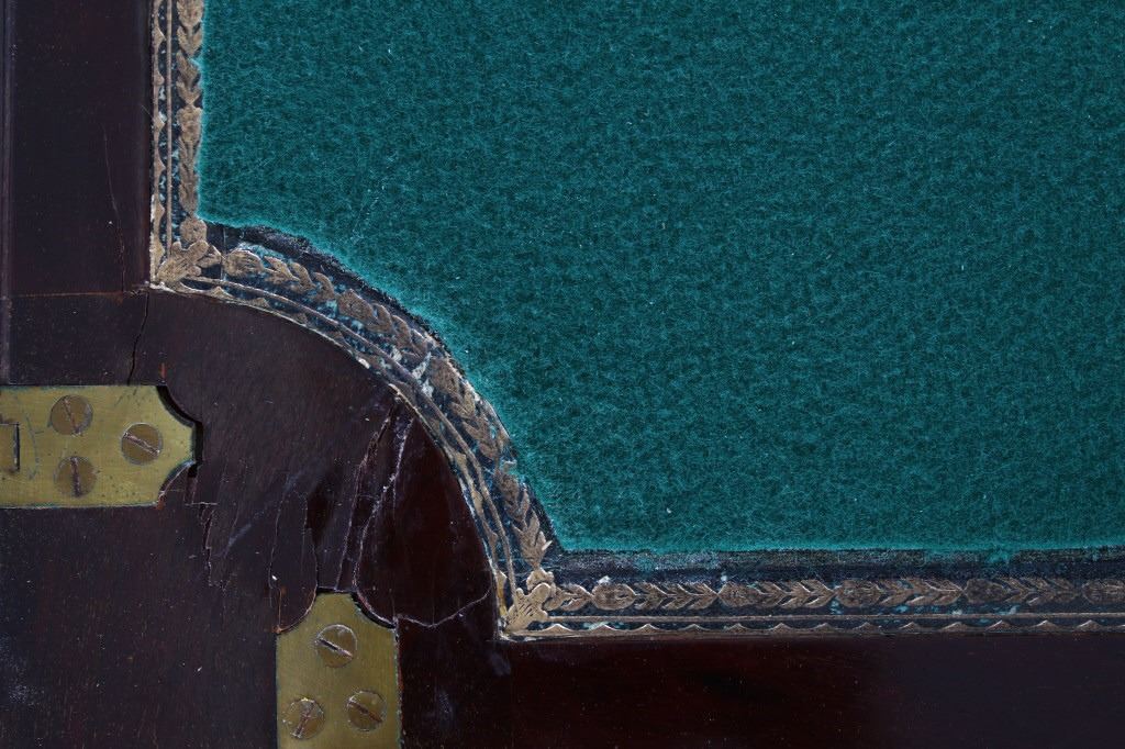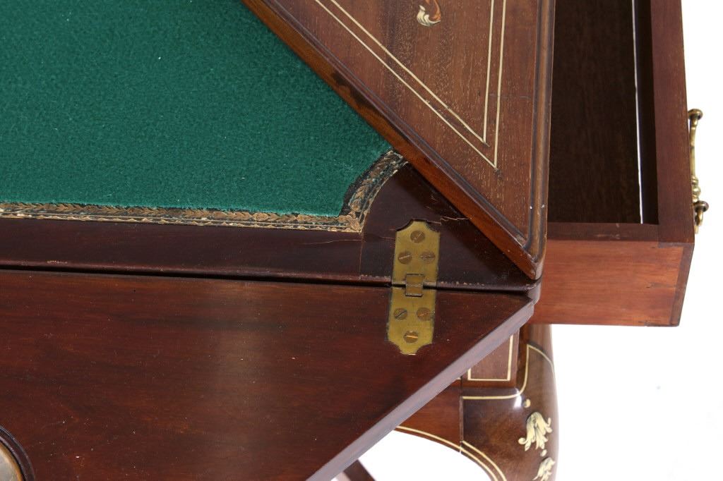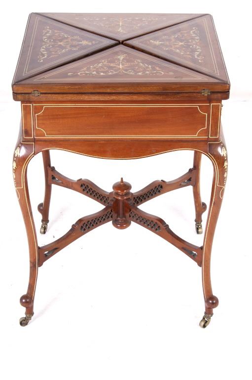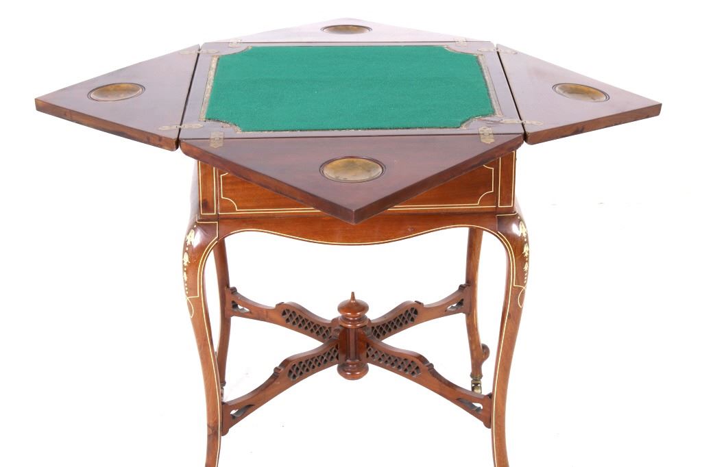 For your consideration is this Ornate Quad Clover Foldout Italian Gaming Table. This gaming table is crafted from flamed mahogany with elaborate ormolu feet in excellent original Italian polished finish with small metal wheels. This quality custom fold 4 diamond table can be turned to open up to reveal an elaborate green felt table top with game piece dishes at each corner. The condition of the table is pristine with all parts and hinges functional. To open the table you rotate the table just slightly and one of the clover fold out corners will pop up and you can open up the rest. This table is decorated in ornate intricate gilding showing floral competition decorating the top, and delicate designs along its sides and decorating the drawer with brass handles. The measurements of this gaming table are 28" x 30" x 30" fully extended out.