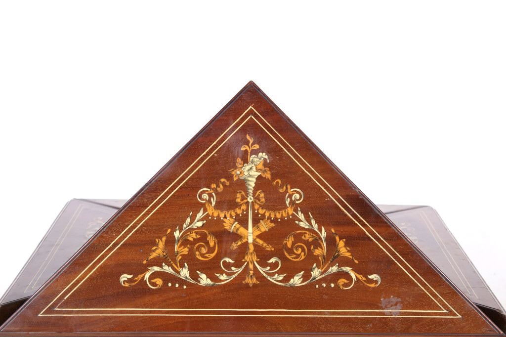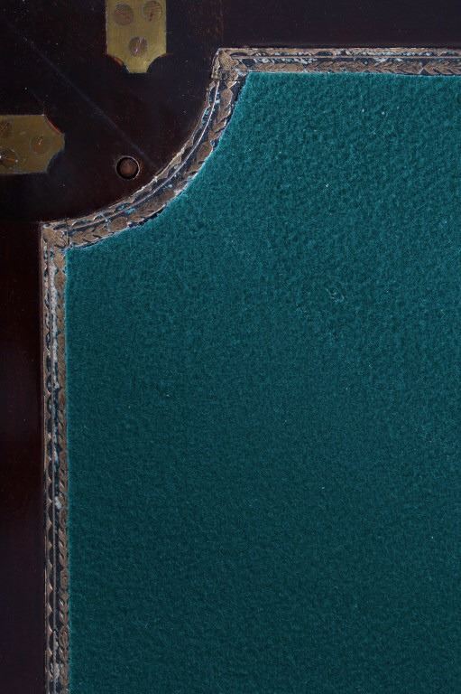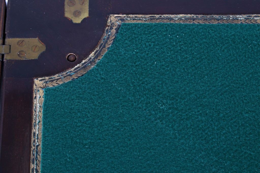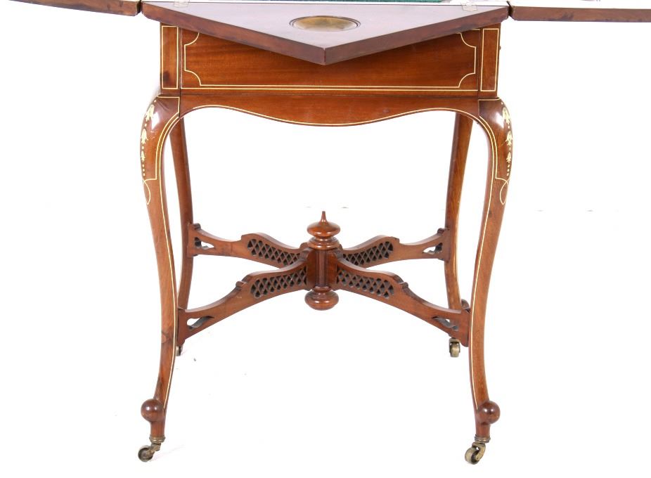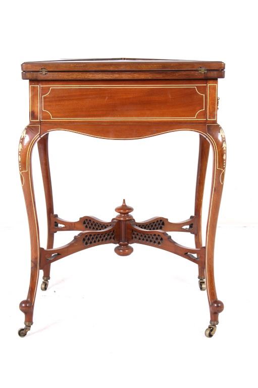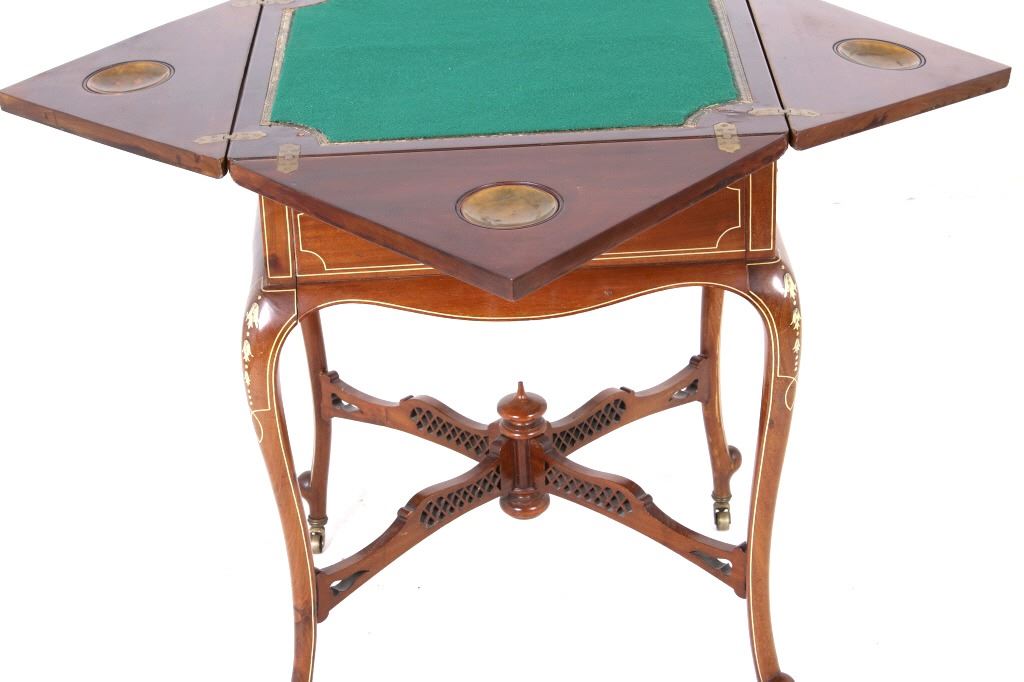 For your consideration is this Ornate Quad Clover Foldout Italian Gaming Table. This gaming table is crafted from flamed mahogany with elaborate ormolu feet in excellent original Italian polished finish with small metal wheels. This quality custom fold 4 diamond table can be turned to open up to reveal an elaborate green felt table top with game piece dishes at each corner. The condition of the table is pristine with all parts and hinges functional. To open the table you rotate the table just slightly and one of the clover fold out corners will pop up and you can open up the rest. This table is decorated in ornate intricate gilding showing floral competition decorating the top, and delicate designs along its sides and decorating the drawer with brass handles. The measurements of this gaming table are 28" x 30" x 30" fully extended out.