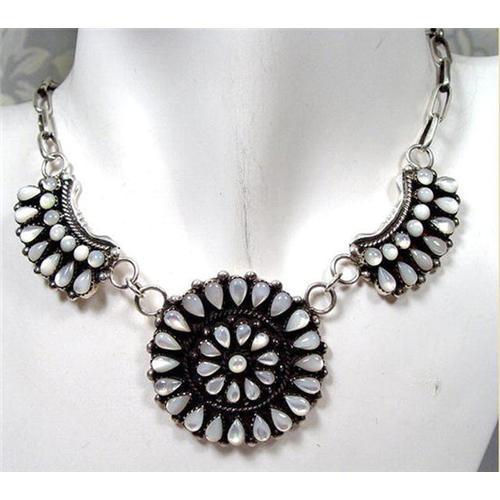 Always genuine stones ~ Always sterling silver ~ Always superb quality for your purchasing dollar. The necklace has an overall length of 18.5". The center motif measures 40mm diameter. The side motifs measure 33x12mm. The gram weight is 56.5. (03-780)