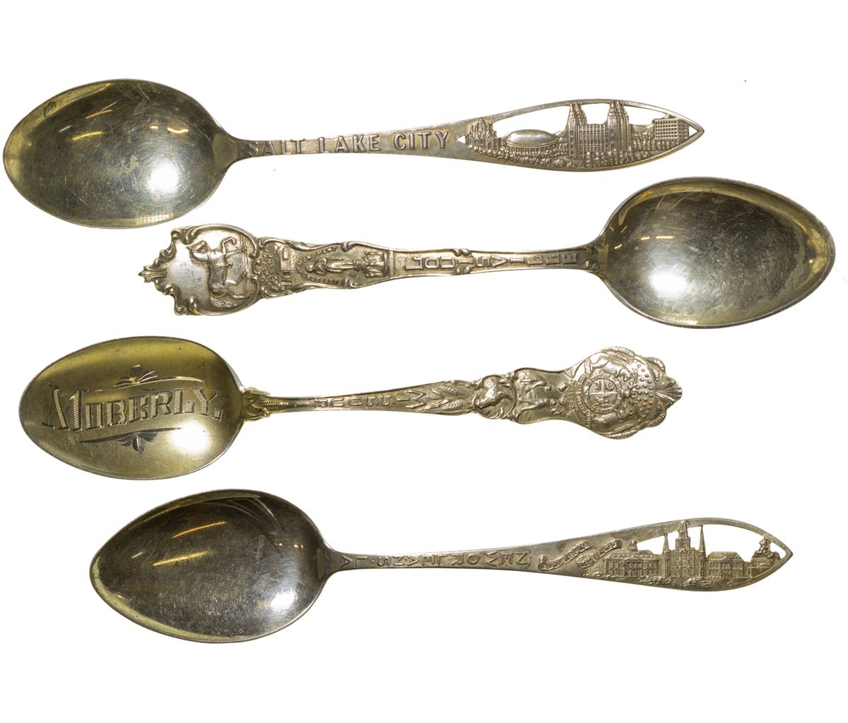 Lot of 4 sterling spoons, each 5.5" long. 1) A Salt Lake City, UT spoon with a cutout and embossed handle featuring the city skyline. 2) A Louisville, KY spoon with an ornately embossed handle featuring Kansas scenes. 3) A Moberly, IL spoon with an ornately embossed handle and "Moberly" engraved in the bowl. 4) A New Orleans, LA spoon with a cutout and embossed handle featuring the city skyline. -56645