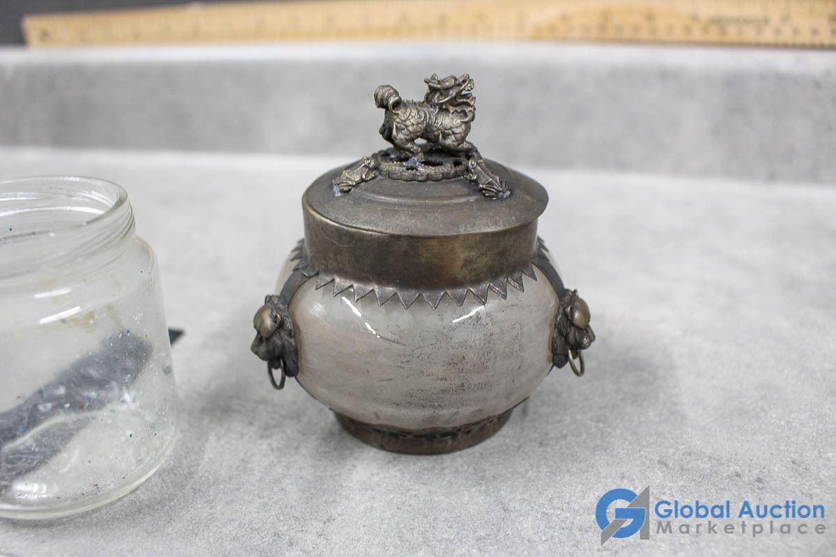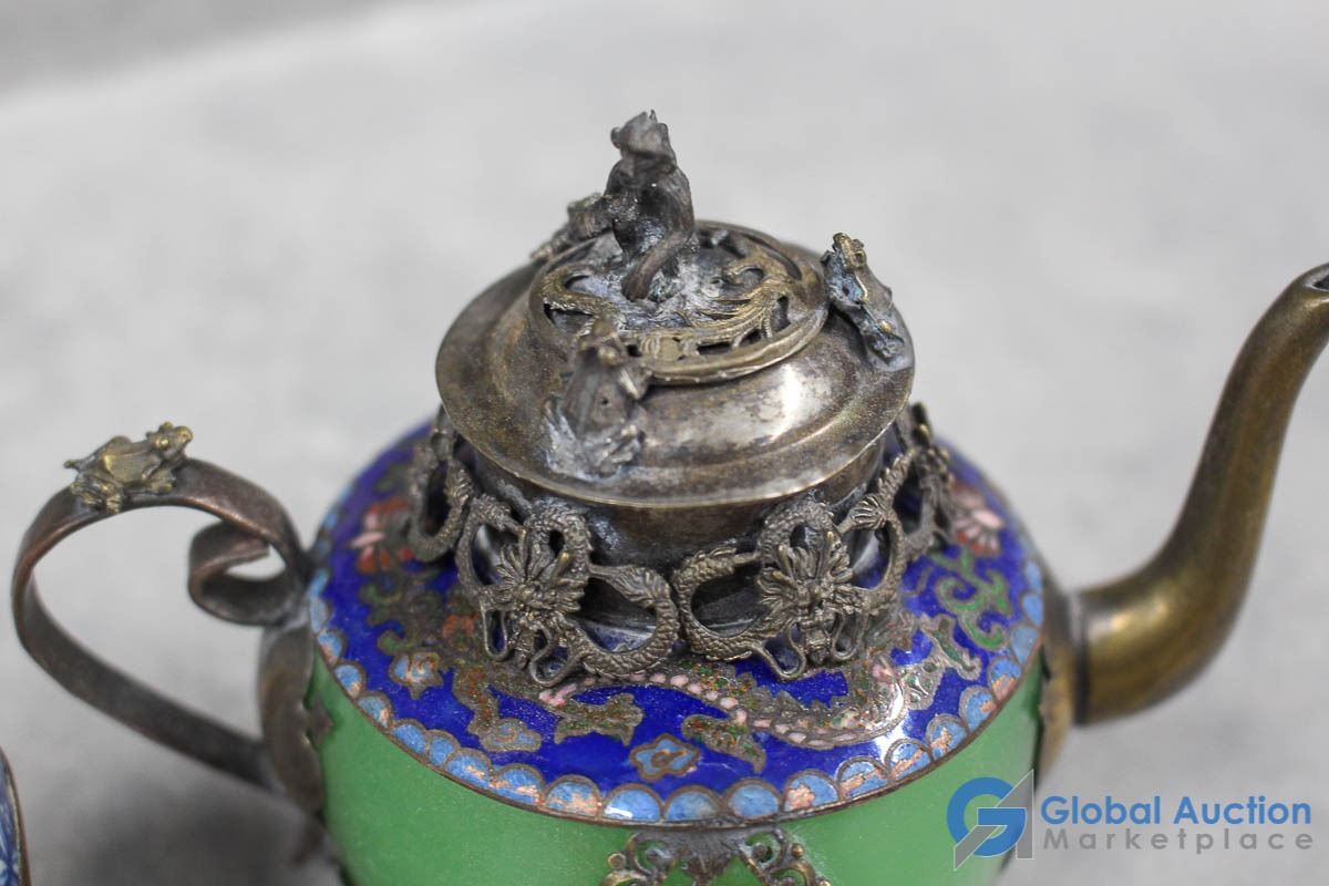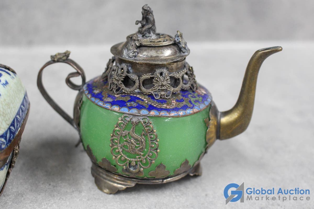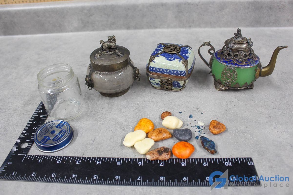 Ornate Small Teapot, Dishes & Rocks