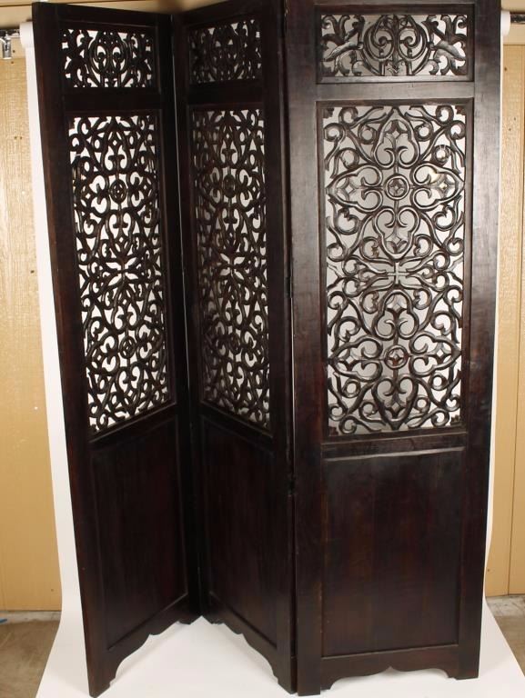 Beautifully carved wood three panel room divider/screen. Solid construction. Measures 60" x 72". Great looking piece of furniture.
