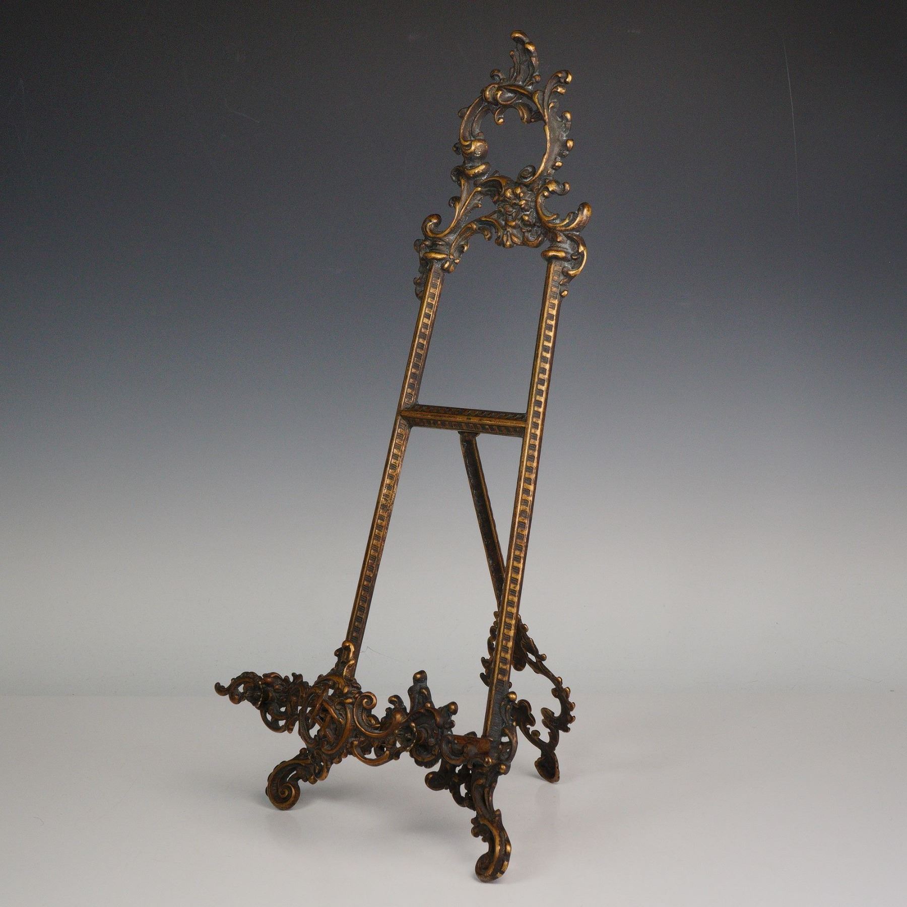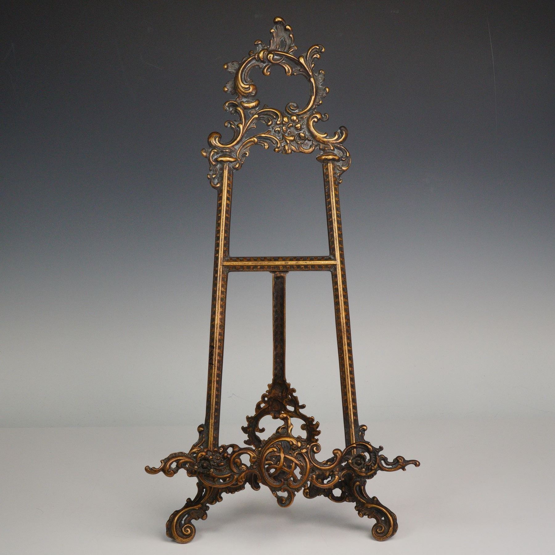 A richly detailed Victorian style brass tabletop easel featuring elaborate scrollwork and floral flourishes. Its gilt finish highlights the intricate openwork design, with curved feet and a decorative crest lending a sense of refined grandeur. Perfect for displaying small frames, mirrors, or fine art, this piece combines elegance with sturdy craftsmanship.
