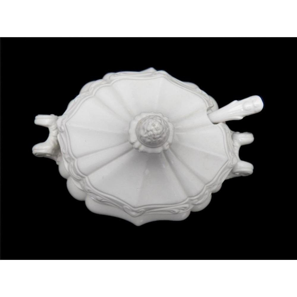 Vintage Victorian style ornate tureen with acanthus scrolled handles. Sculptural acorn lid top. Marked on bottom - Italy. Comes with the matching ladle, all in excellent condition. 7 1/4"H X 7"W X 4 1/2"D.