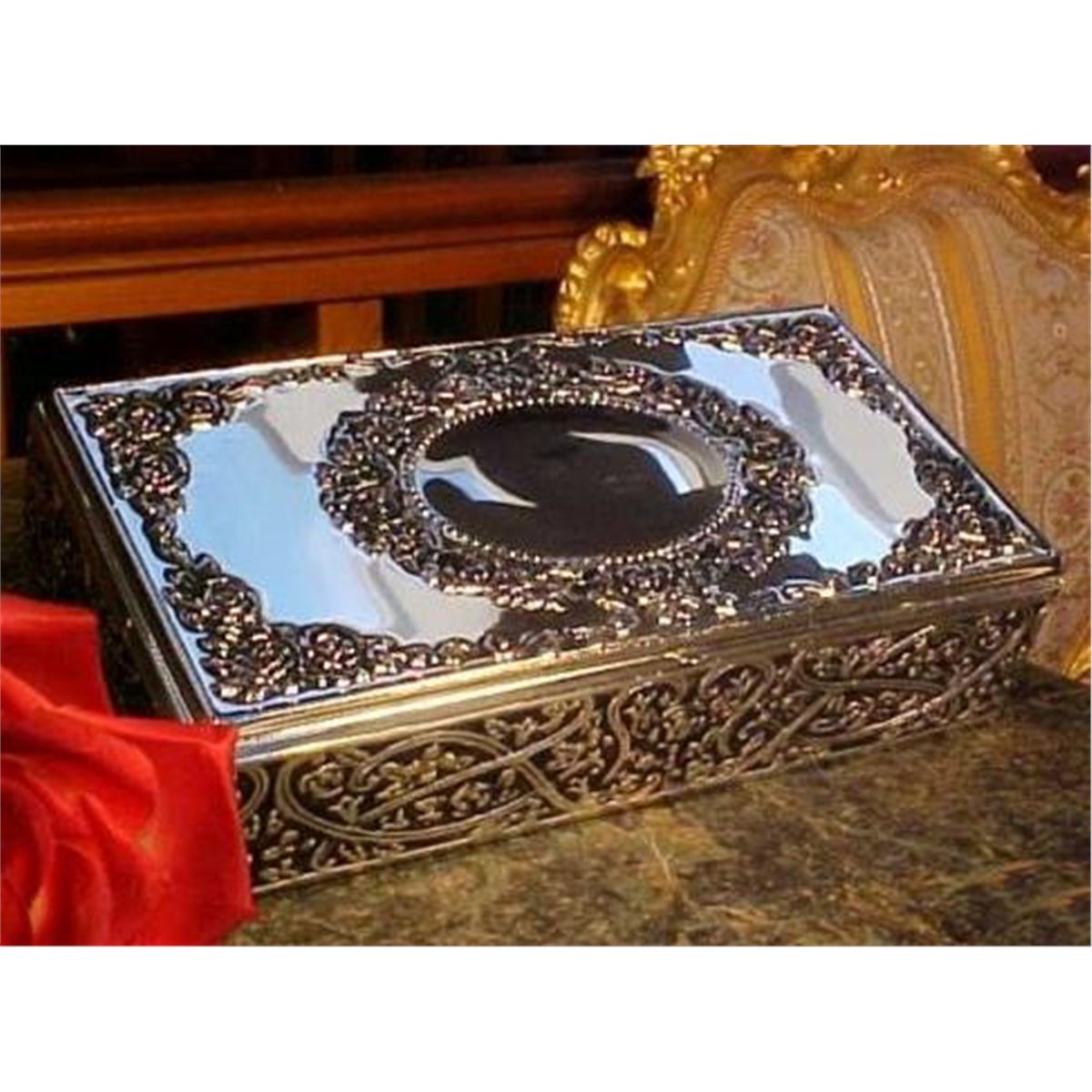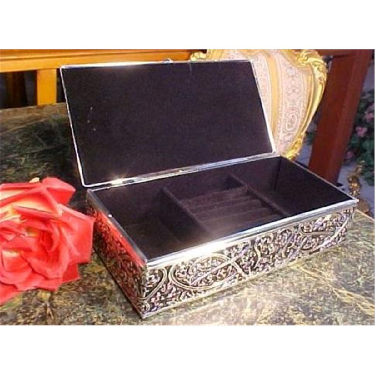 Ornate Victorian Style Silver Jewelry Box, measures 8 3/4in by 4 1/2in wide and is 2 1/4in tall, interior is black velvet, silver plated.