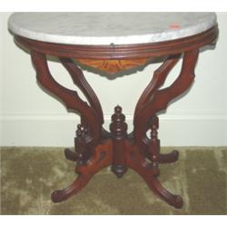 Ornate Victorian walnut marble top table. Measures 28" tall and top measures 25 3/4" x 18".