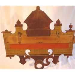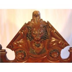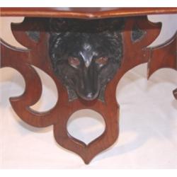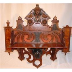 Ornate Victorian walnut wall shelf with burl walnut inserts and figural lion head & wolf head decoration. Minor wear to top and right finial missing. 25" x 27".