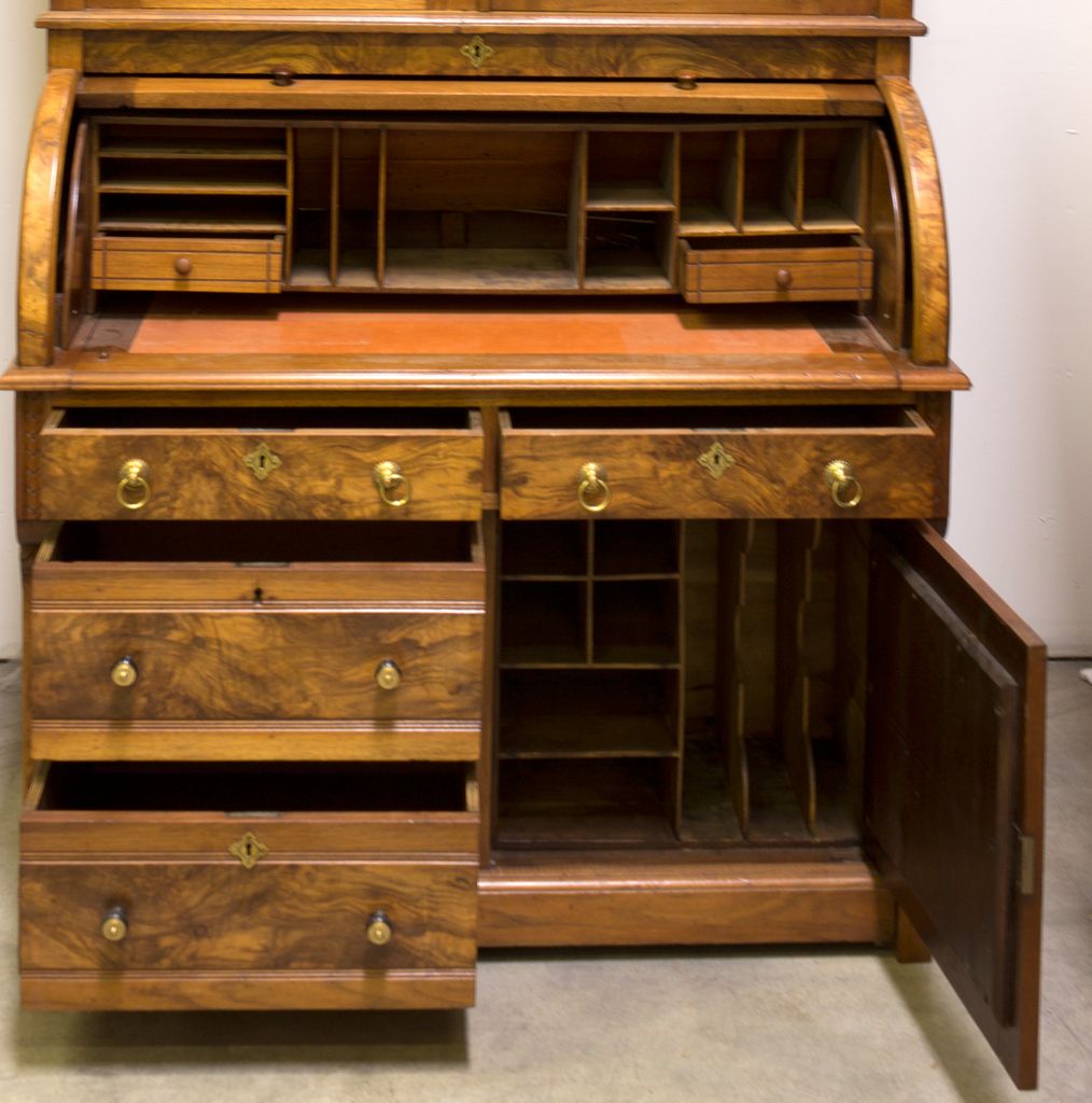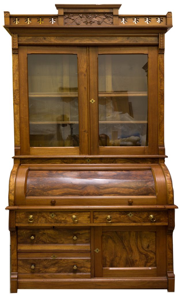 This impressive Victorian secretary belonged to Congressman Sam Arentz, who acquired it from a Virginia City family and had it shipped to his Smith Valley home. After his use of the secretary, the piece moved on to the Rhodes family of Reno. This beautiful piece remained in the care and possession of the same Nevada family for 4 generations and 130 years before it was sold at auction in 2004. Arentz served from 1921-1922 and 1925-1932. Beautiful, professionally restored. Measures 3' 6.5" wide x 7' 3" tall, rich marbled maple. A classic secretary with 2 glass doors securing a bookcase above the roll top desk portion. Includes many drawers, cubbies, and other storage spaces. Also features hand cut gingerbread patterns typical of the Victorian era. A gorgeous piece fit for any Victorian or western collection. - Woodward Collection -60268