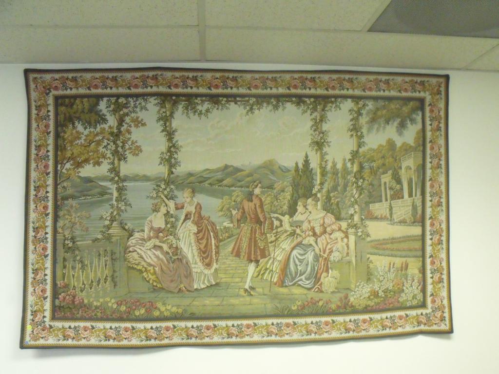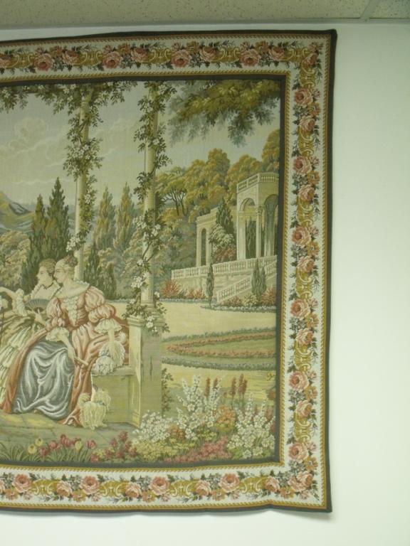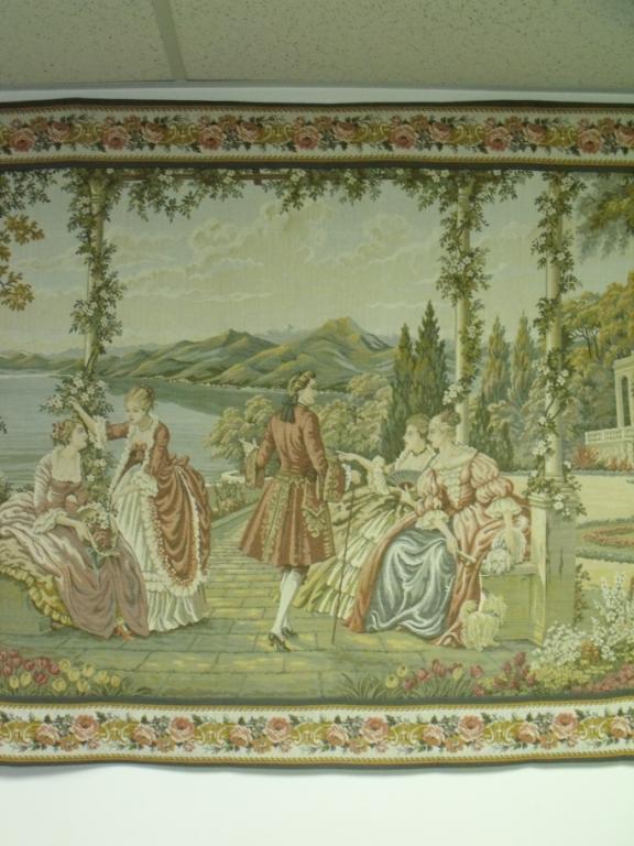 Beautiful Italian style classical tapestry depicting royalty of Milano at palatial mountain retreat. Has floral boarder and is done in various pastel colors. 48"x74" in near new condition.