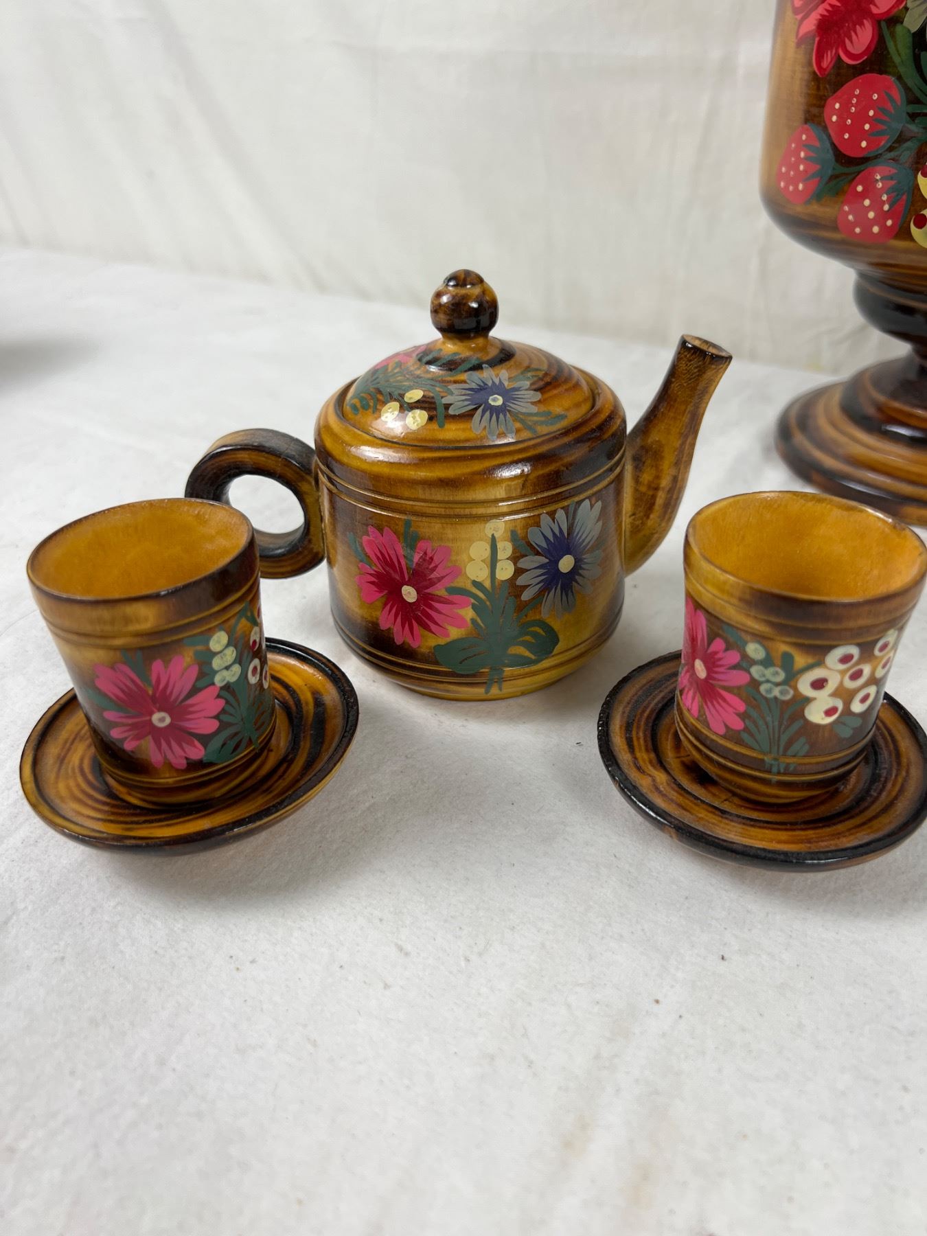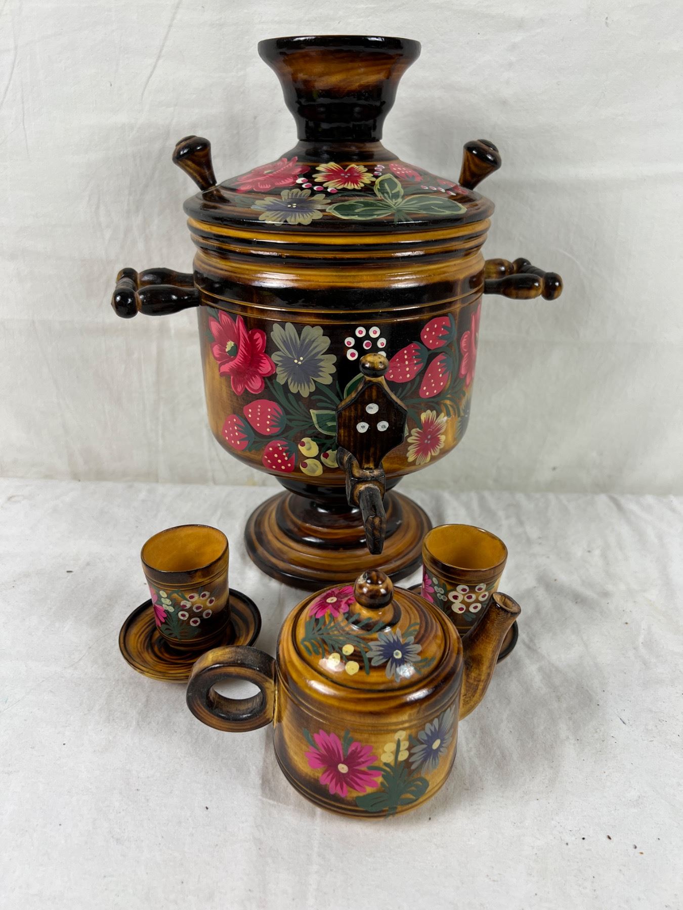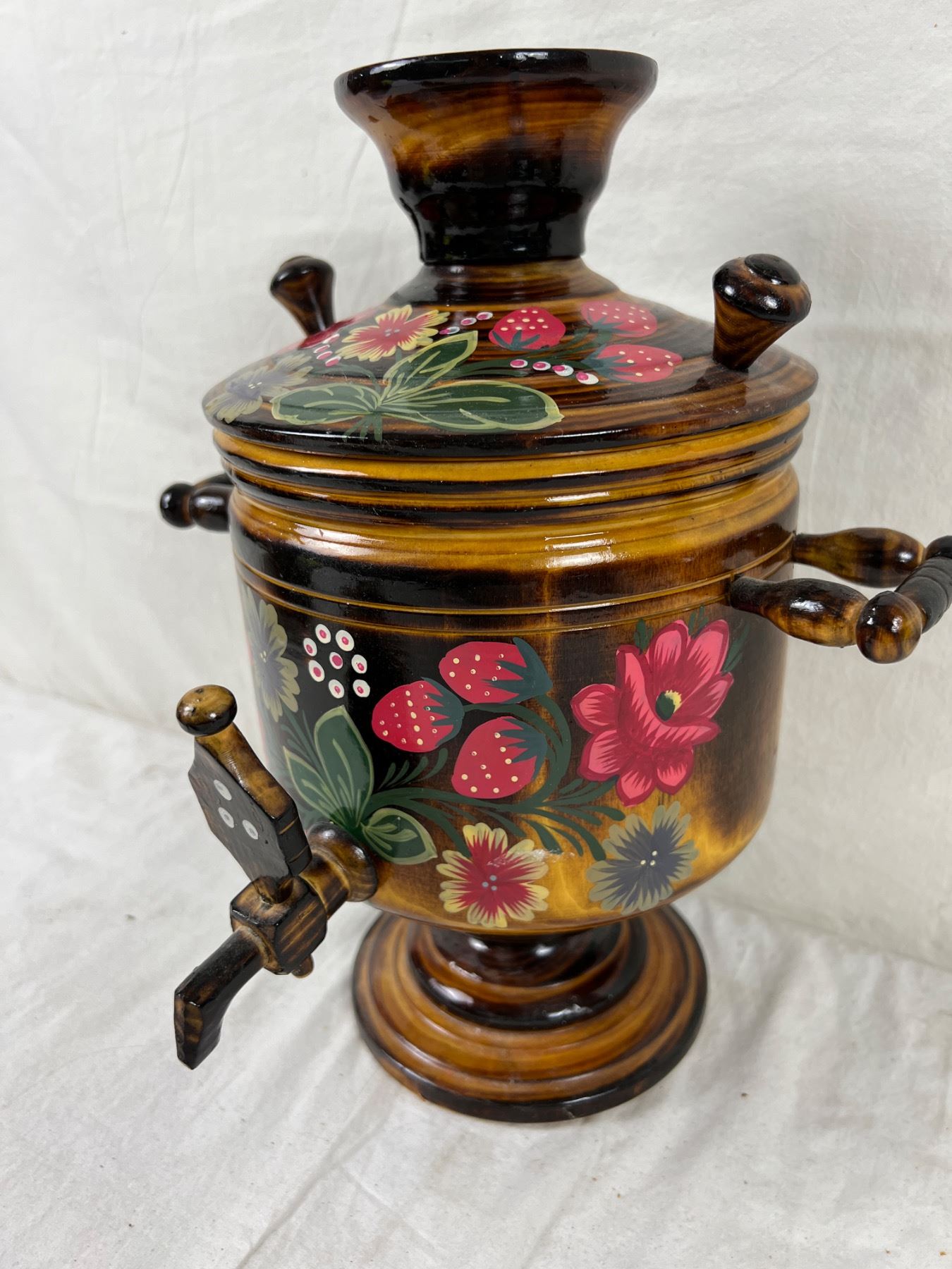 Floral Samovar we have been advised by the client is from Soviet Russia, mid-80s. Measures 12" tall and 7" in diameter