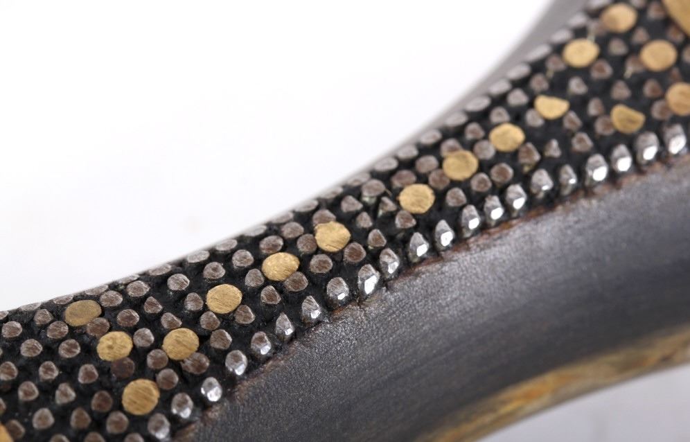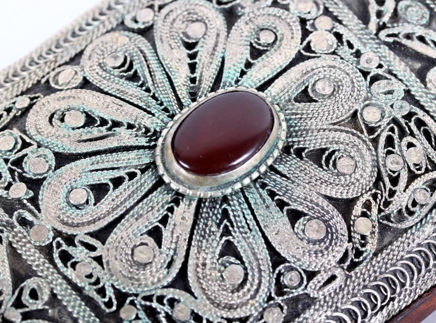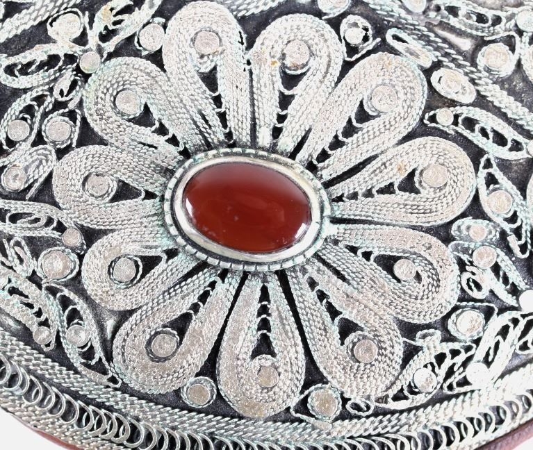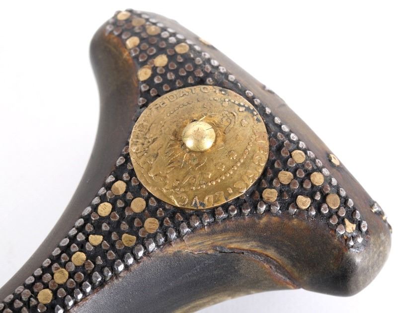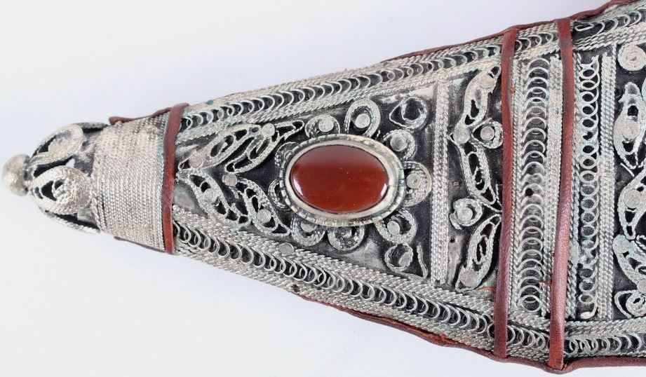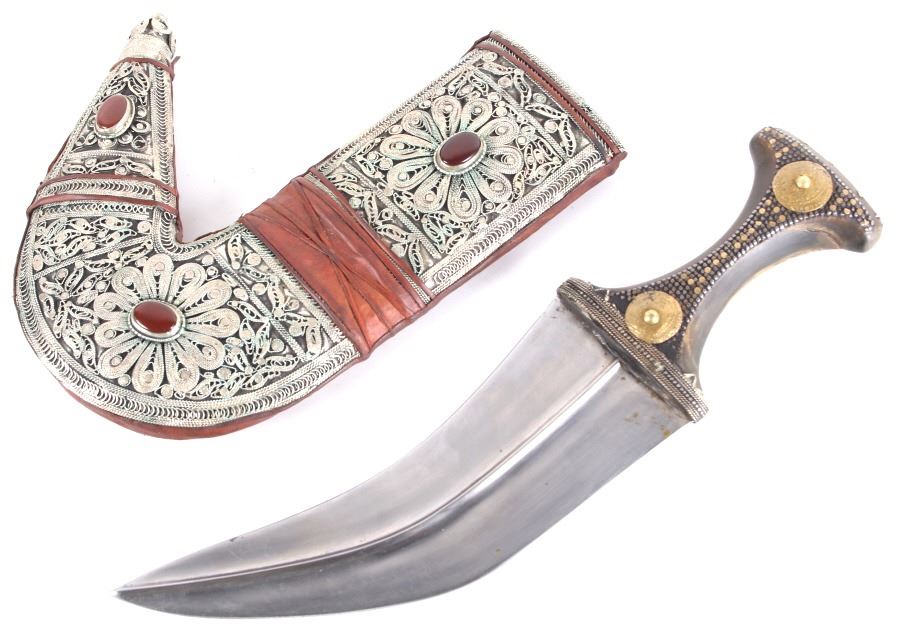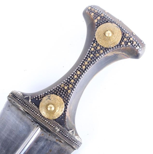 This dagger is a fine example a Janbiya dagger. This dagger has a ornate brass and steel tack design on the beautiful wood handle. The sheath is also very intricately decorated, with set jewels and spun wire designs. This piece is in good condition for its age. It measures 13 1/4" L x 7 3/4" W with a blade length of 7 3/4"