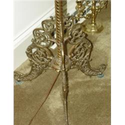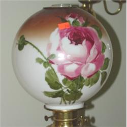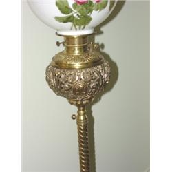 Ornate brass piano lamp with floral decorated shade. Measures 59" tall.