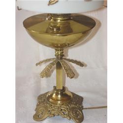 Ornate brass table lamp with relief floral decorated shade. Measures 20 1/2" tall.