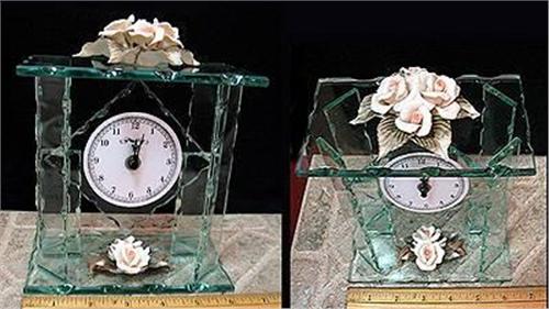 Ornate crystal clock with porcelain floral accents. Battery clock. Stands 7 1/2" tall