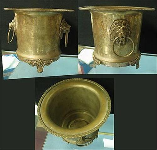Ornate footed wine bucket with lion handles. Stands 7 7/8" tall and measures 9 1/2" across weighs 3.20lbs