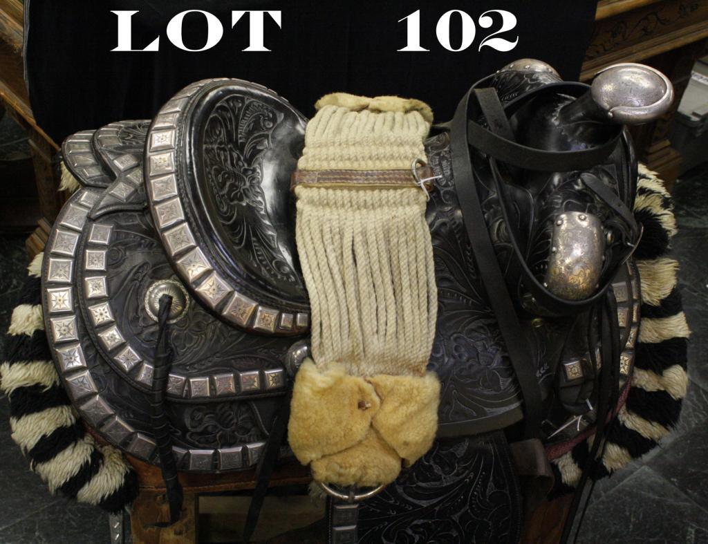 Ornate highly silver mounted parade saddle circa 1930s to 1950s by MacPherson of Los Angeles in overall very good condition showing extensive tooling in fancy floral designs and extensive engraved sterlingsilver decorations on the saddle, bridle, skirts and leather trapaderos; the saddle is accompanied by a heavy horse blanket with alternating black and white wool trim and belly cinch. One of the nicest exampleswe’ve seen in recent times and great for use or display. Est.: $3,000-$6,000.