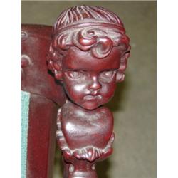 Ornate mahogany armchair with cherub decoration. Decoration shows two carved cherub busts on both top corners of back. Measures 39" tall to top of back.
