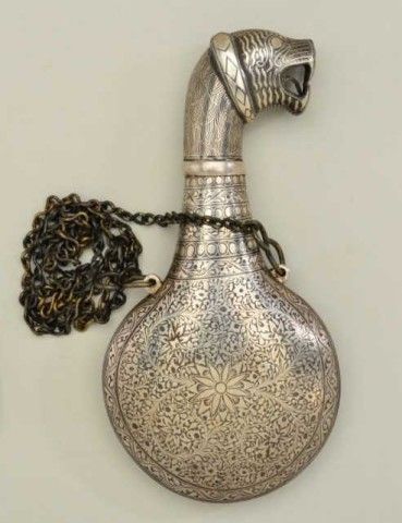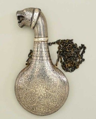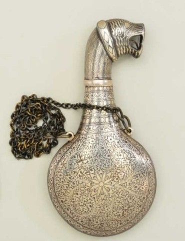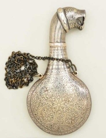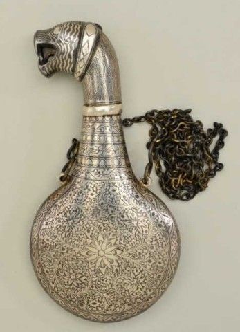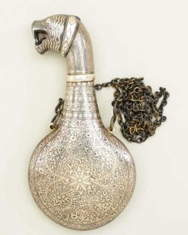 Ornate mid eastern powder flask probably from India showing figural head of tiger on top with silver damascene inlaid into blued metal background. The flask measures 8” in height by 4” across the center. In sin good tovery good condition with a well made hanging type chain. The silver work is very good quality and would date to the 19th or 20th century. Est.;$1,500-$3,000.