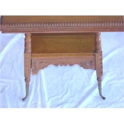 Ornate oak lamp table with carved leaf decoration on bottom shelf. Measures 29" tall and top measures 26" square.
