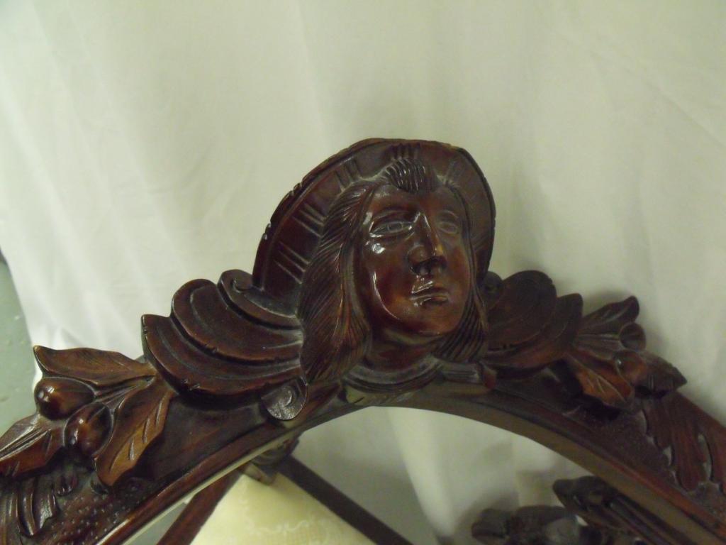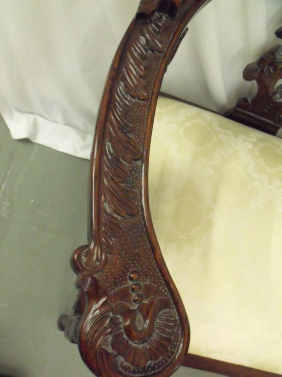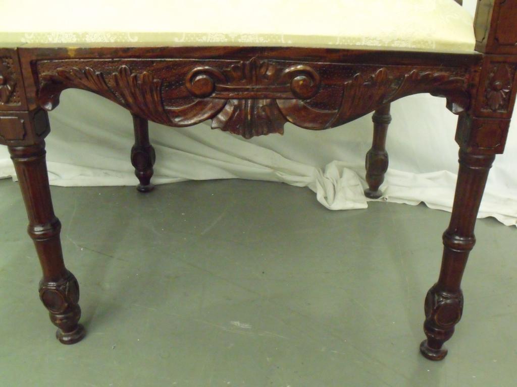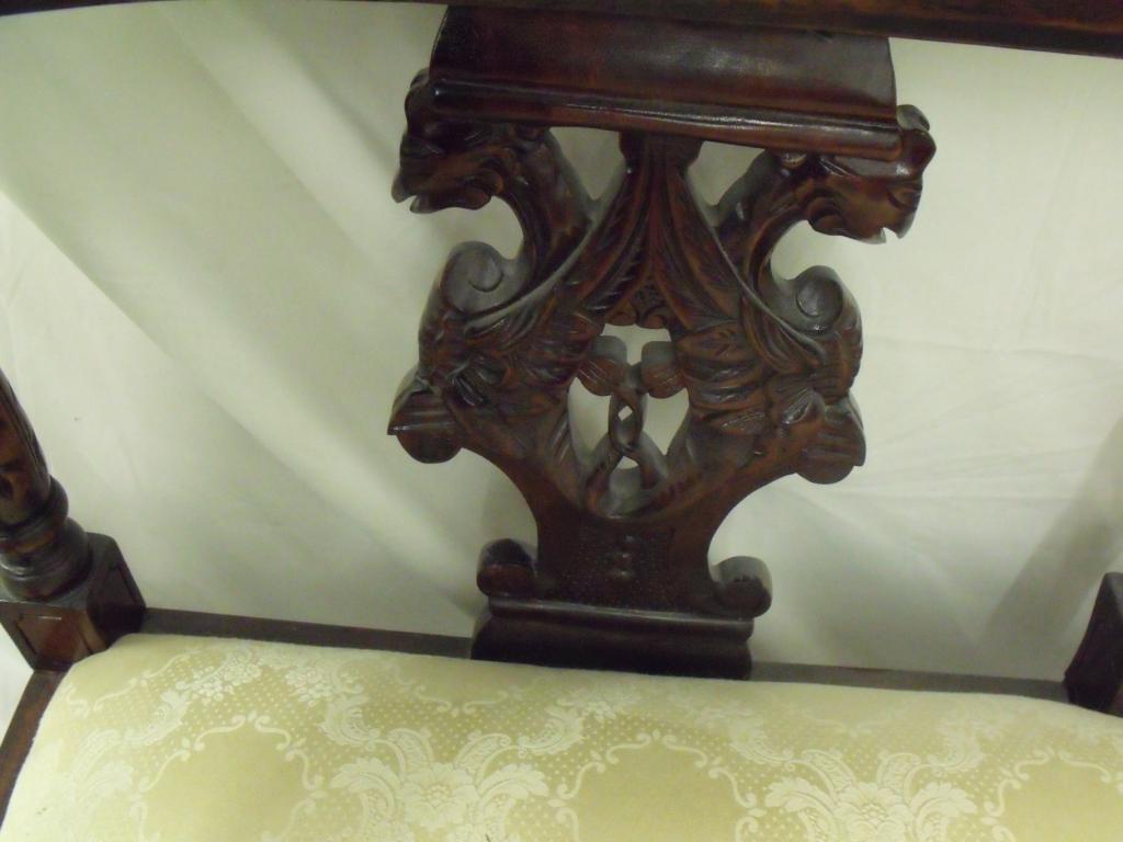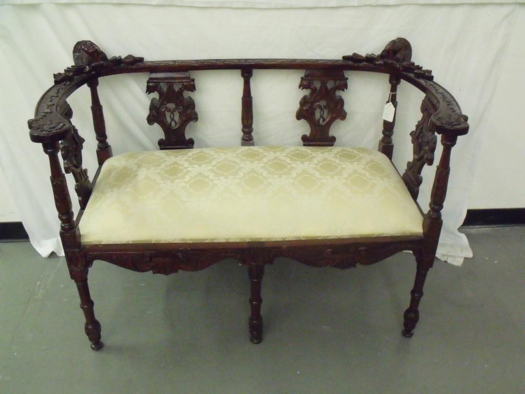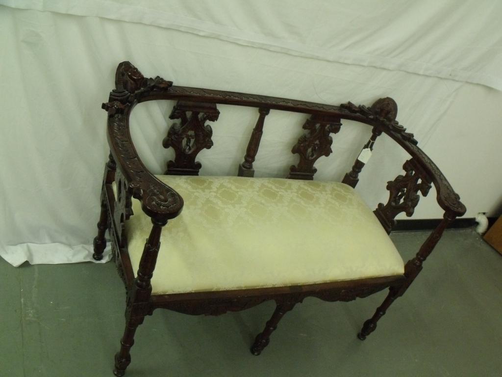 Dark wood and cream cushioned ornately carved satte. Has turnstyle legs, carved decorations on arms. Very unique piece! 32" tall 51" long 24" deep in good condition.