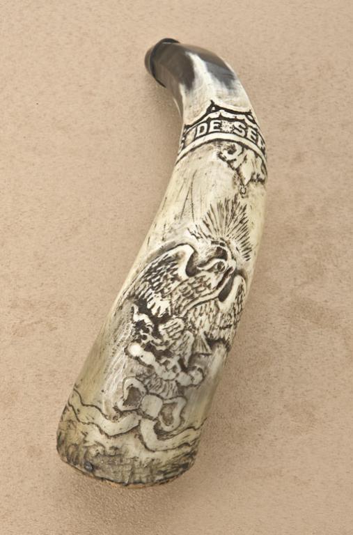 Ornately carved 19th century powderhorn from Mexico showing high-relief carved Mexican snake and eagle at center, and date “1816 September 1889” in Spanish. Letter engraved with Real Del Monte (Mountain Road). The horn measures 9-3/4” from tip to end. The wood plug shows some small losses and there is some slight damage to the horn. The spout plug is missing, condition is generally good overall. An attractive Mexican artifact. Est: $600 - $1,200