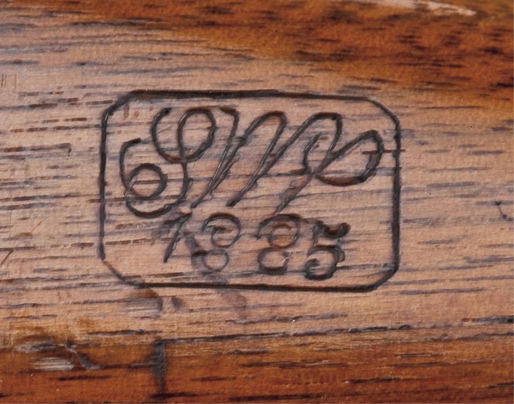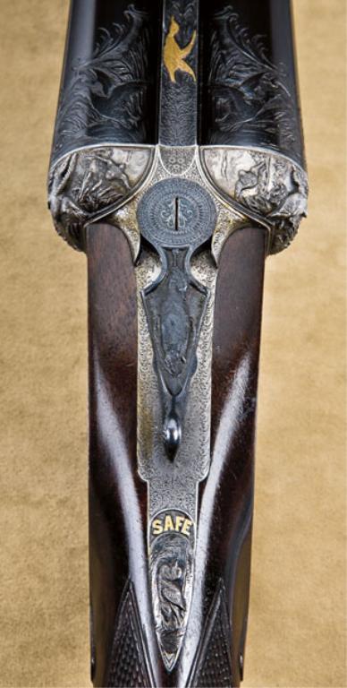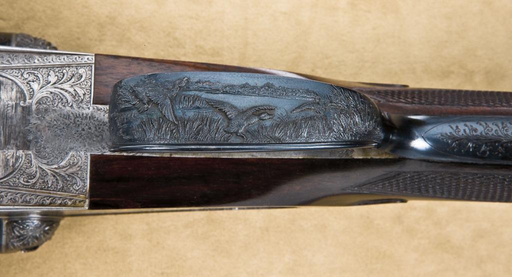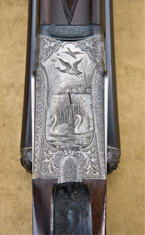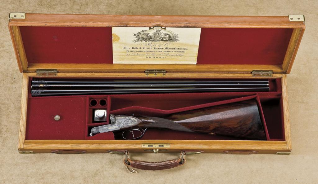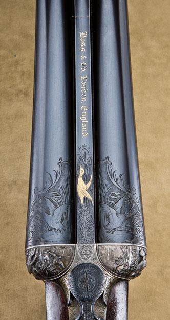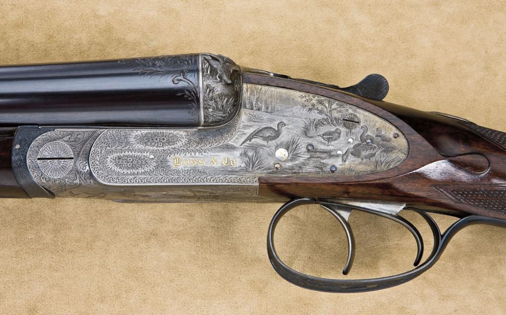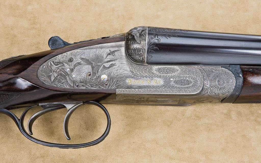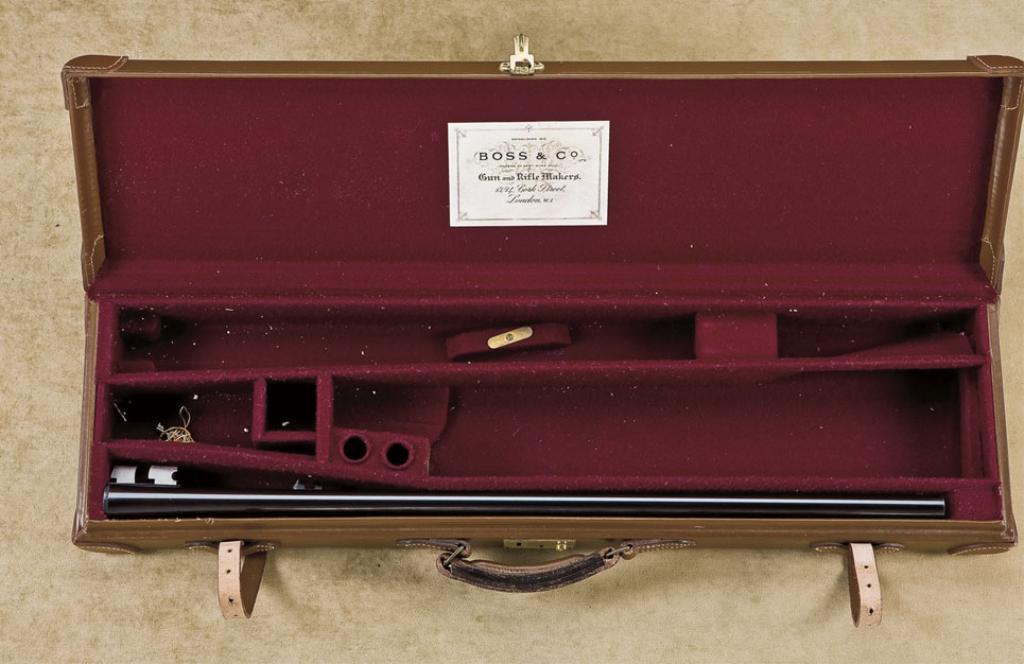 Ornately engraved and high relief chiseled Boss Side lock Shotgun with extra set of barrels and second case, serial #5196. This fine gun is beautifully engraved in game scenes surrounded by best quality Banknote Engraving with chiseled in high relief fences on back of action with engraving and gold inlay extending on to the back of the barrels. The original set of barrels measure 28 ¼” and the stock measures 15 ½” from the front trigger to end of checkered wood English style butt. The gun has been London restored with 98-99% blue on barrel and guard, 50-60% original case drifting to silvery grey and stock shows excellent freshening and light restoration. The #1 barrels are Nitro proofed for 1 ¼ oz. loads and the gun dates about 1908 although it is not listed by serial # in “Boss & Co” a book by Donald Dallas. A similar engraved gun is attributed to John James Sumner which is pictured on page 262. The original period case is leather over oak with canvas cover. The case is fine to near excellent and shows correct period Boss label with 13 Dover St., Piccadilly, London Address. In the 1970’s this gun was sent to Boss and an extra set of 12 gauge barrels were made along with a second luggage case which accepts both barrels. The #2 barrel set measures 27” is numbered 5196 to match and 9707 on lugs for Boss inventory control. This set is marked for 2 ¾” and 729 on each breech with modern Nitro proofs. The gun has seen just slight use since its return to Boss. Case #2 is near excellent. A most unusual and especially deluxe Boss Side lock Double from the Classic Era with Desirable modern upgrade and refitting. A two barrel gun of this quality with such fine ornamentation would be considerably over $100,000. at today’s rates with a long delivery wait. Est. $35,000-70,000