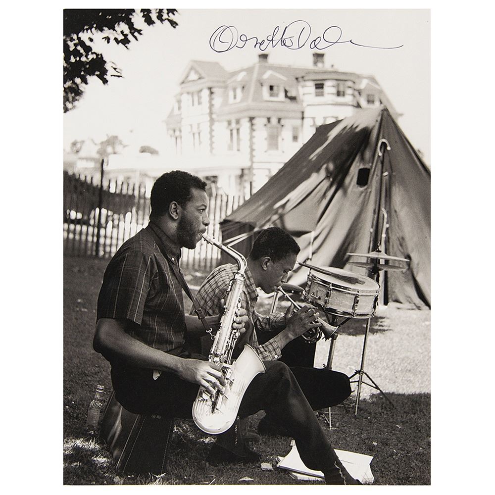 Semi-glossy 8.5 x 11 book photo of Ornette Coleman seated and playing the saxophone outdoors next to another jazz musician, signed in black felt tip. In fine condition.