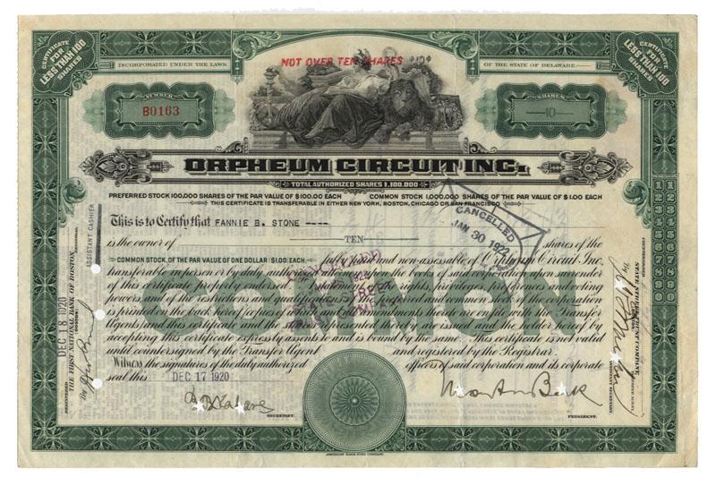 Stock certificates from the United States and other countries around the world. Items offered cover a wide variety of collecting topics including automotive, railroads, mining, autographed and much more.