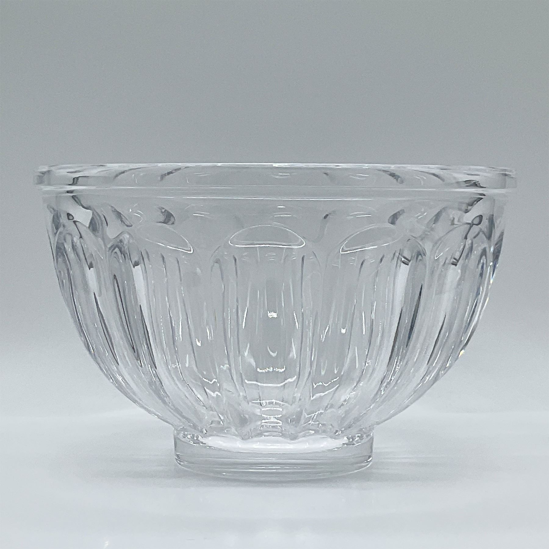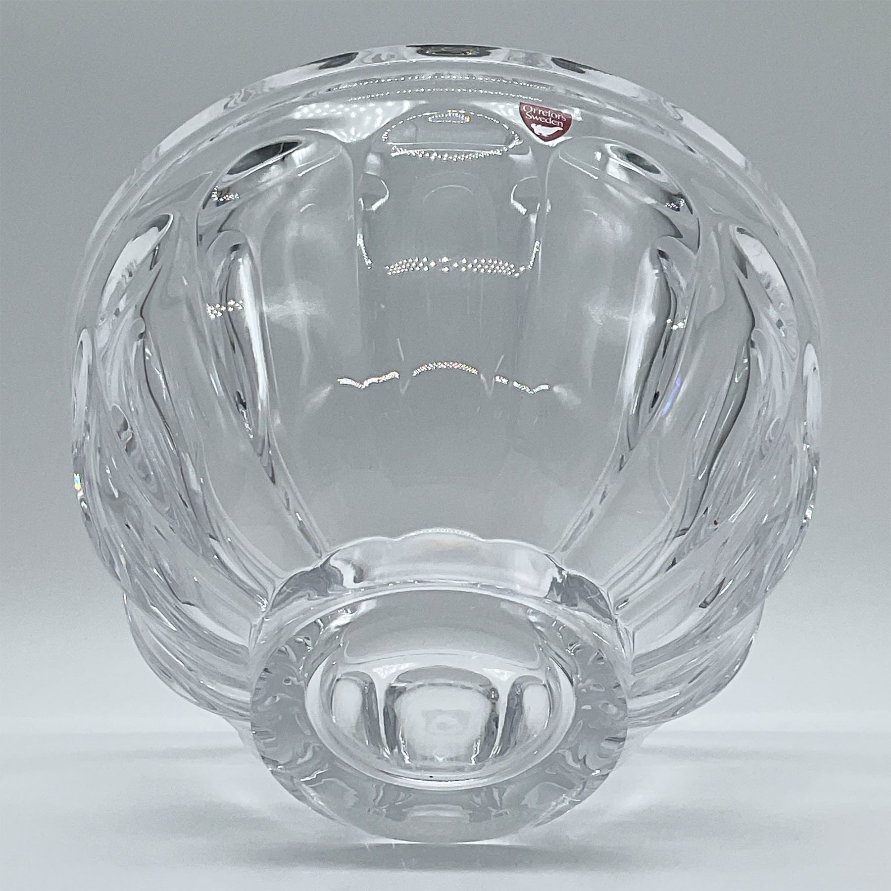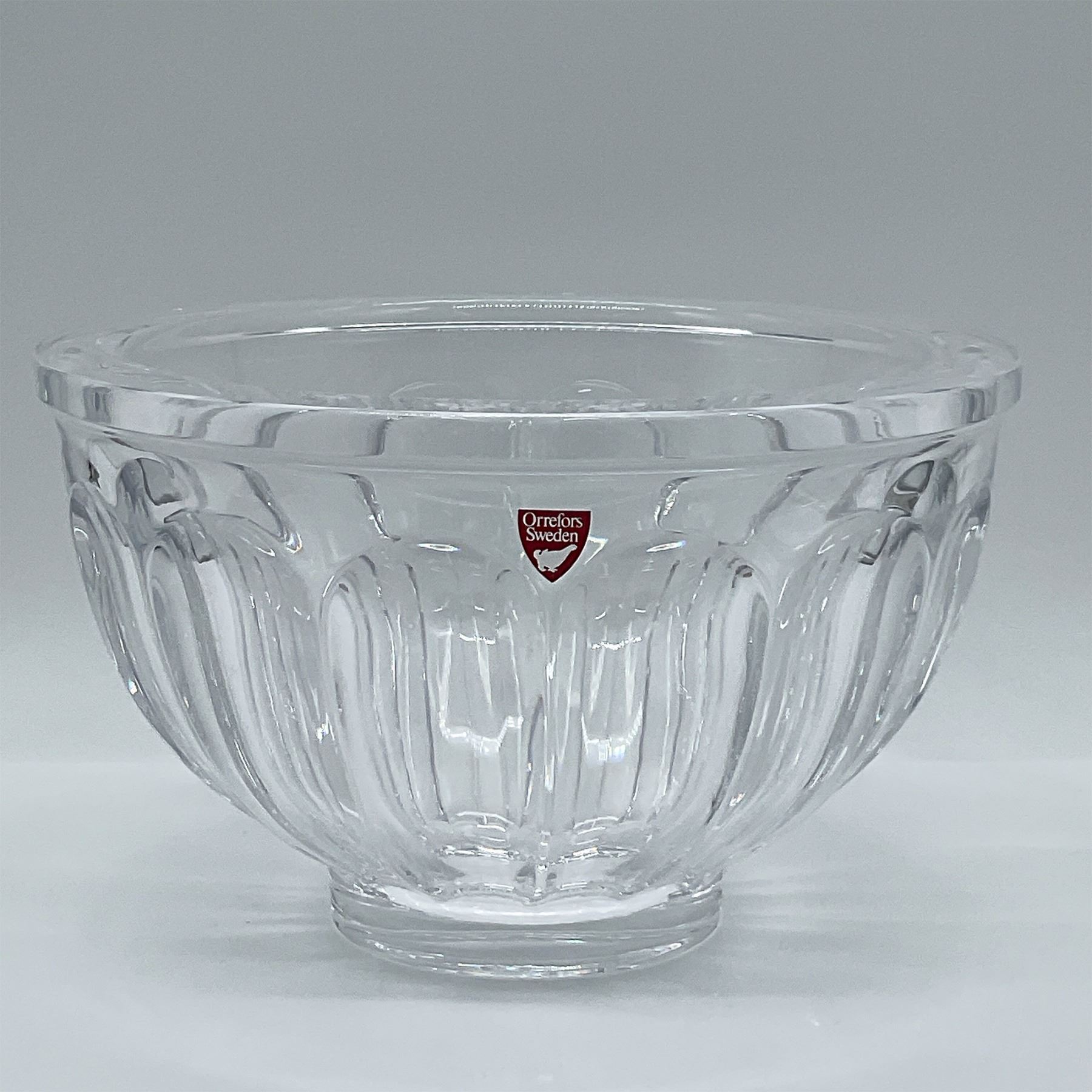 Elegant Orrefors crystal bowl from Sweden, showcasing a timeless design with fluted details along the sides. Crafted from high-quality crystal, this piece reflects the masterful artistry and precision associated with the Orrefors brand. Measuring 5 inches in height, the bowl is perfect for use as a decorative centerpiece or functional serving piece. Retains the original Orrefors Sweden sticker. A fine addition to any collection of Scandinavian glassware. Brand signature on base.